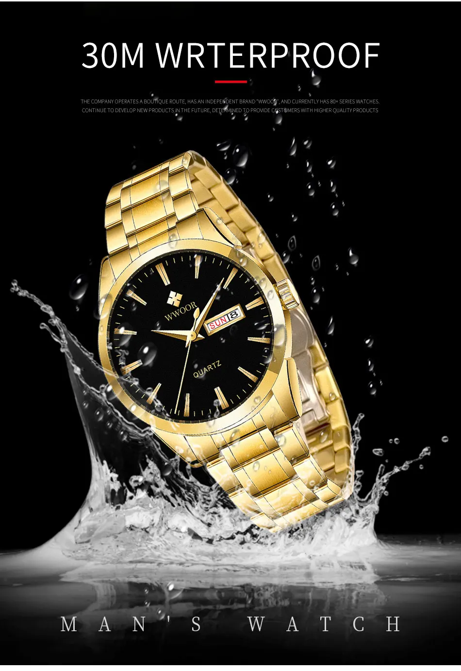 Мужские кварцевые часы WWOOR, водонепроницаемые золотые часы из нер...