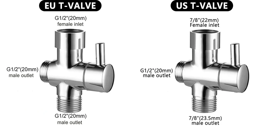 Т-клапан (1/2 "):G1/2 "(20 мм) Женский вход и G1/2"(20 мм) Мужской выход и G1/2 "(20 мм) Мужской выход.Европейский комплект не подходит покупателям из всех европейских стран.Американский комплект не подходит для всех покупателей в США,Просто Европейский набор является общим размером в европейских странах, а американский набор-общим размером в США.Пожалуйста, внимательно проверьте, соответствует ли размер вашим потребностям перед покупкой.