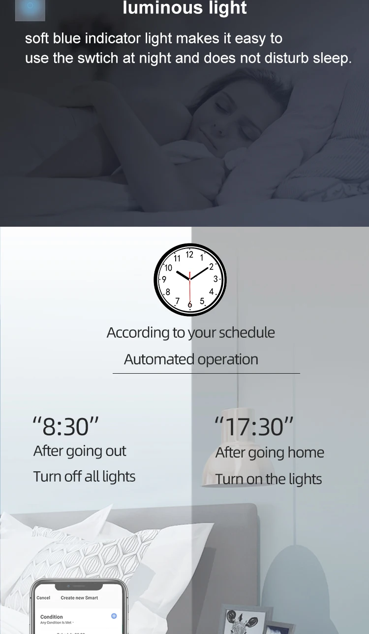 3. Настройки таймера: Установите расписание или таймер, чтобы включить/выключить свет ночью и утром, И тогда вы никогда не вернетесь в темный дом, Когда приедете домой в сумерках. Кроме того, каждое утро вы можете просыпаться бесшумно на запланированный светильник.