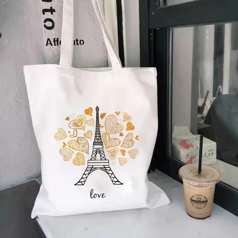 Сумка для покупок с принтом Love I Paris, сумка для покупок, сумка-тоут, холщовые сумки, женская хлопковая тканевая сумка через плечо, Женская эко-сумка, многоразовая продуктовая сумка