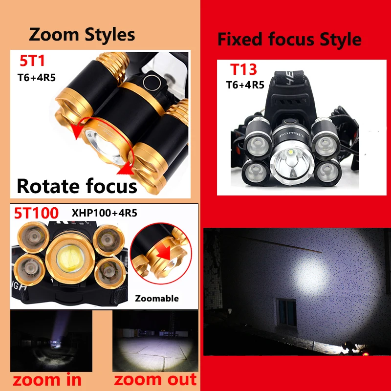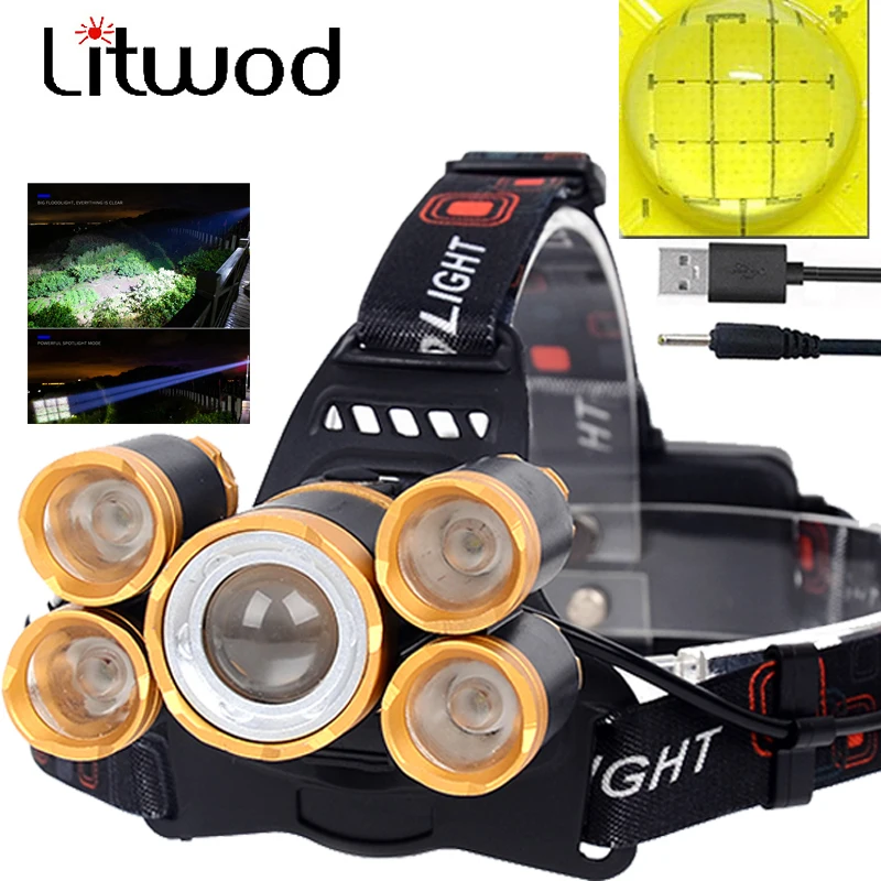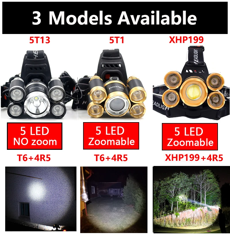 Мощный налобный фонарь XHP199 с 5 Светодиодами, перезаряжаемый налобный фонарь, водонепроницаемый фонарь для охоты, рыбалки, кемпинга, уличный фонарь