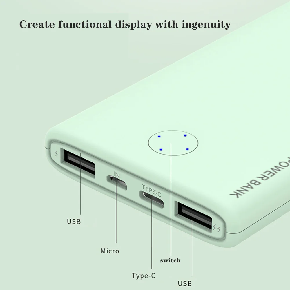 10000Ah Мобильный Внешний аккумулятор, светильник, тонкий корпус, большая емкость и длительный срок службыДвухпортовый вход, улучшен двусторонний опыт быстрой зарядкиДва входных интерфейса Micro и Tpye-C1,8 Вт одиночный порт выходной мощности более эффективно, используя быстрая зарядная технология aipower,Порт 18 Вт, выходной интерфейс USB, чтобы обеспечить безопасную и стабильную прочностьТок на мобильный телефон, чтобы помочь Вам заполнить мобильный телефонКороткое время.Оставшаяся мощность легко известна, светодиодный источник питанияИндикатор, мощность чистая с первого взгляда, и вы можете контролироватьОставшаяся мощность в любое время.