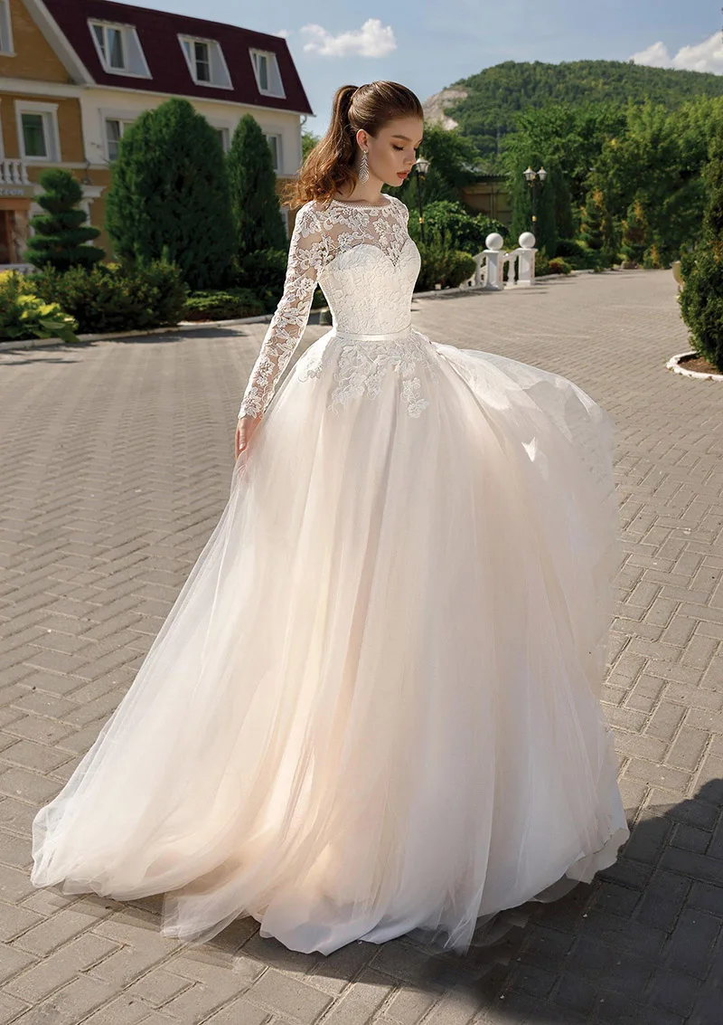 Женское свадебное платье с кружевной аппликацией, длинным рукавом и круглым вырезом