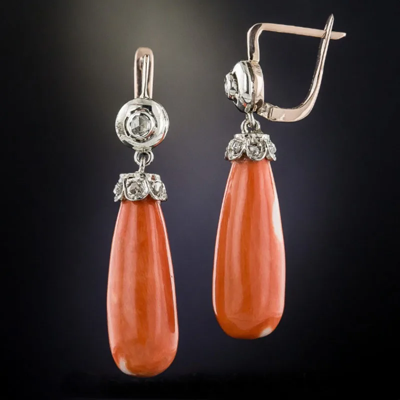 Классические Висячие серьги из красного кораллового камня с фианито...