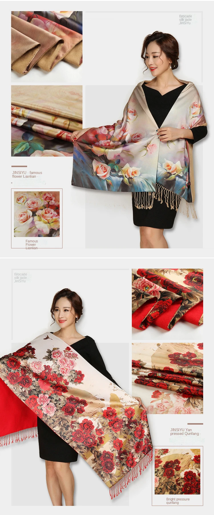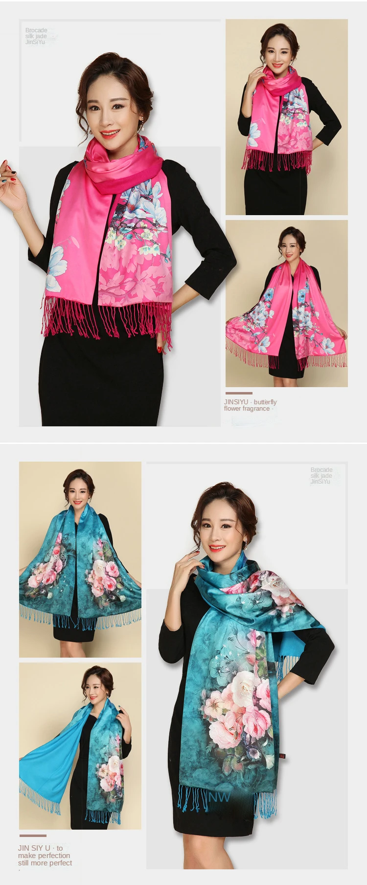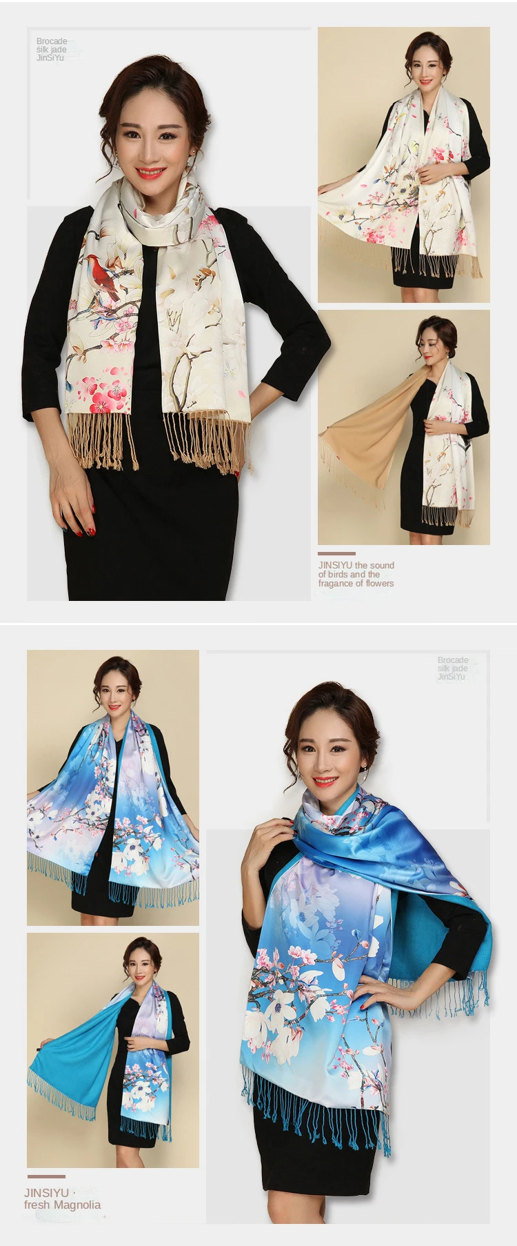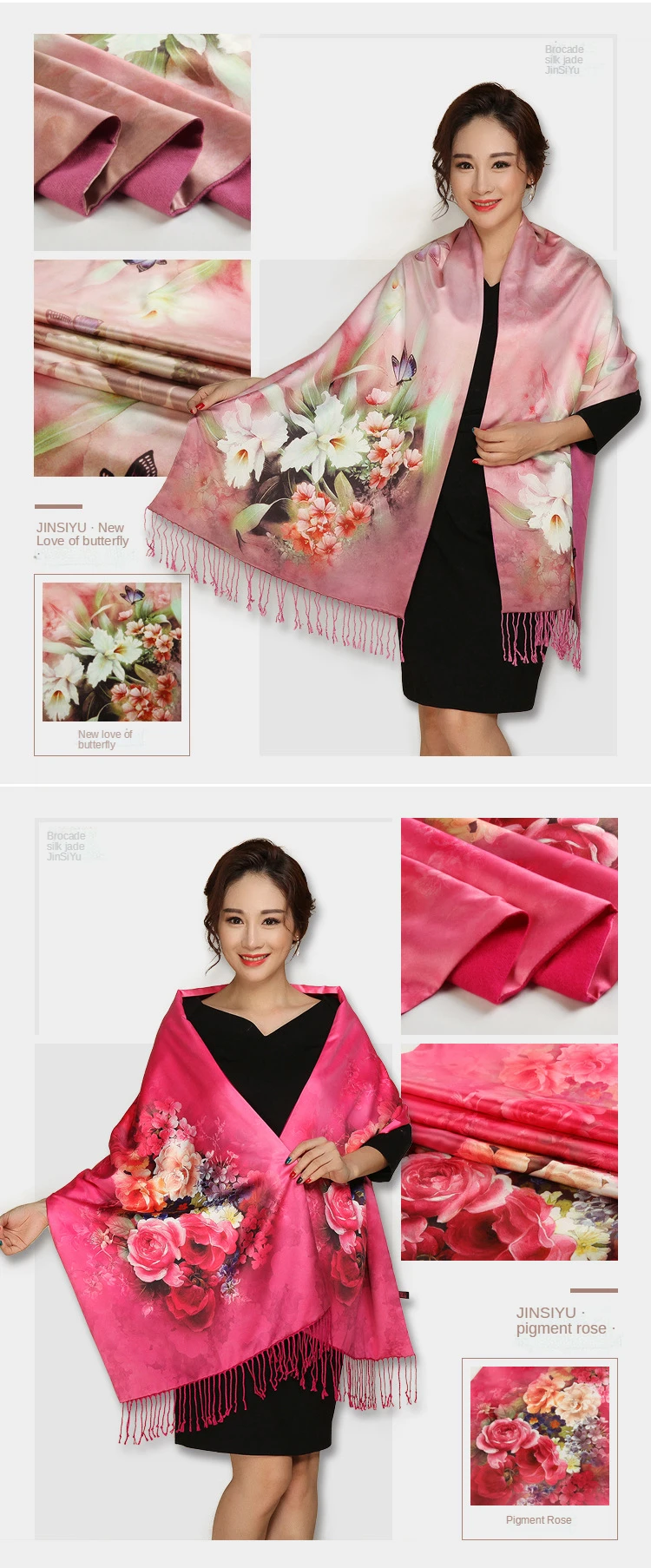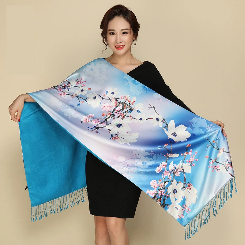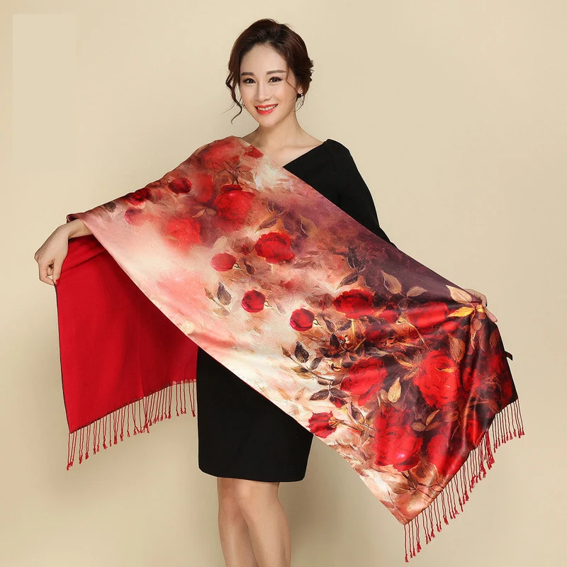 Женский шарф, шелковые шарфы с цветочным принтом, зимний теплый двухсторонний кашемировый шарф, женский длинный Палантин из пашмины, женские шали и накидка