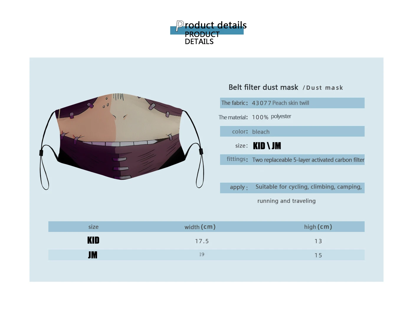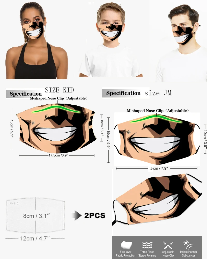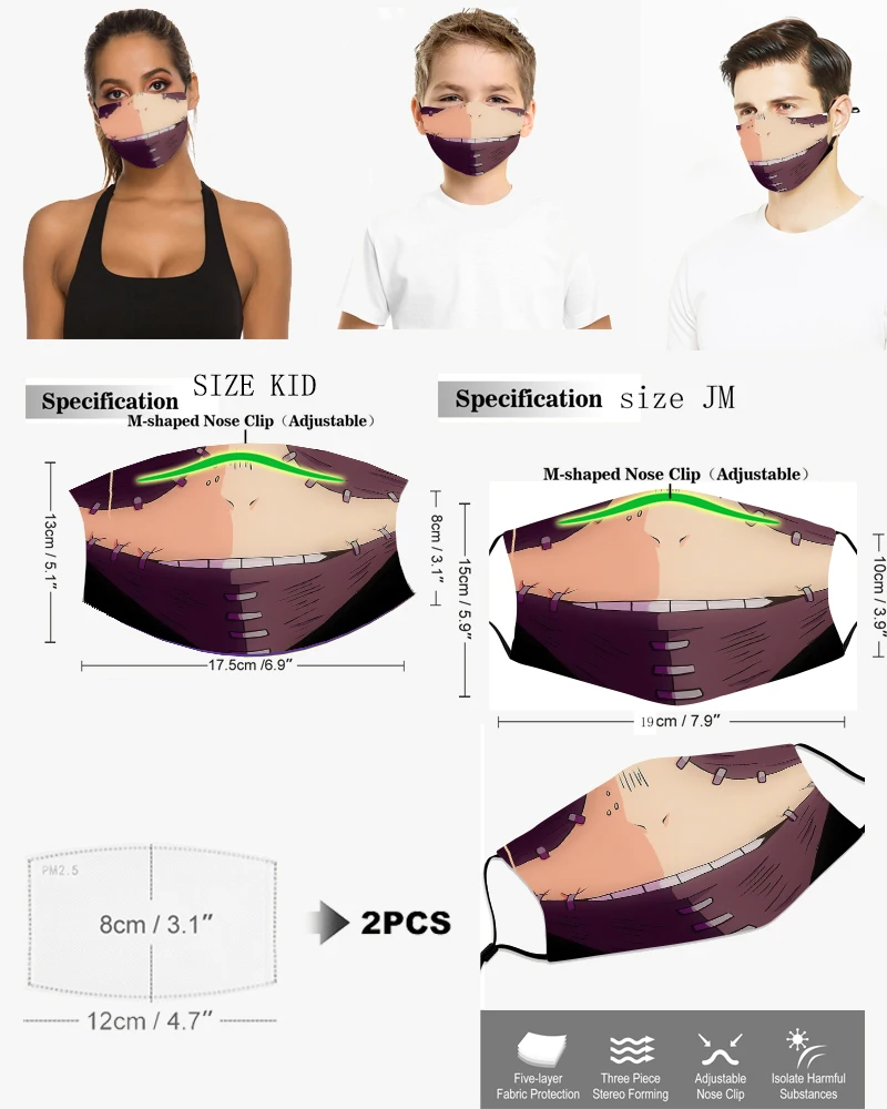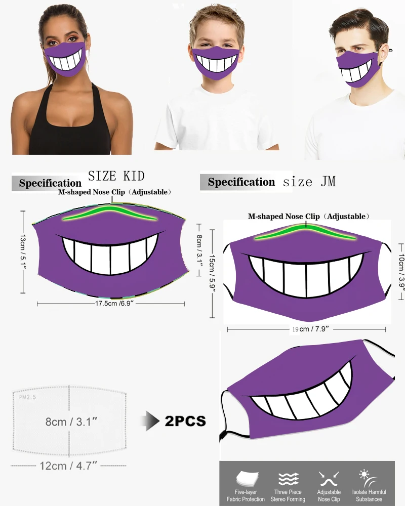 Информация о продукте:Материал: полиэстерРисунок: дизайн с 3D-принтомПрименимые люди: унисексПрименимые варианты: ролевые игры, вечерние мероприятия, праздничные подарки, ежедневные путешествия, путешествия, кемпинг, Велоспорт, хороший выбор для подарков друзьям, семье и себеРазмеры: малыш: 17,5 см * 13 смJM:19 см * 15 см(Погрешность в измерениях может составлять 1-3 см, детям в возрасте до двух лет запрещено пользоваться им)Функции: PM2.5, анти-смог, промышленное анти-загрязнение, защита от выхлопных газов автомобиля, пыли, вторичного дыма, пыльцы аллергии, холода и тепла и т. Д.