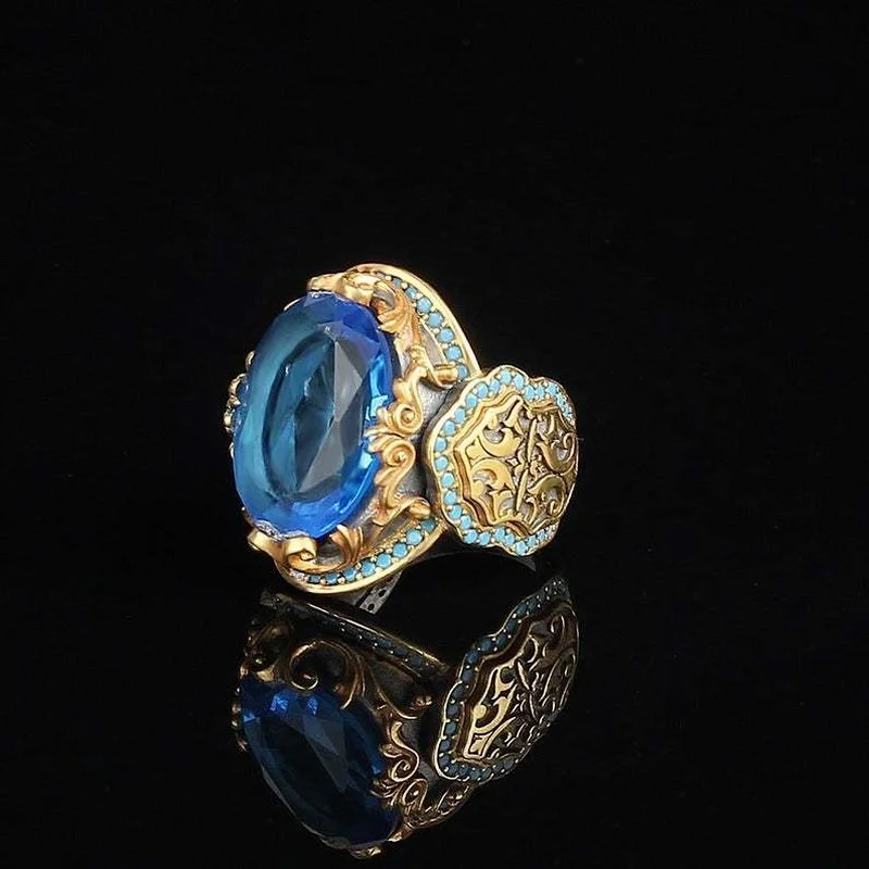 Высококачественное двухцветное ювелирное изделие, резное турмалиновое позолоченное кольцо с синим драгоценным камнем