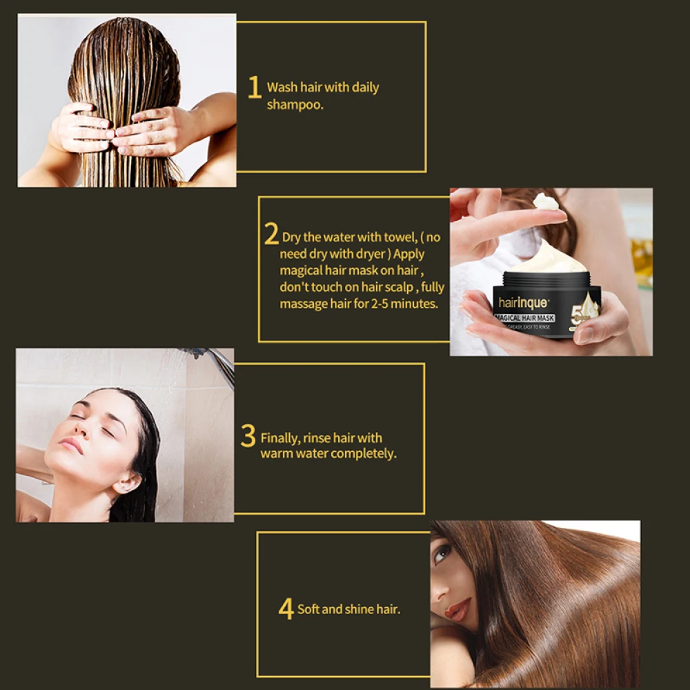 Основываясь на исследовании больше чем волосы положения 10000 потребителей, позаботьтесь об этомПродукты с высокой технологией --- импортное сырье в сочетании с тонкой молекулярнойТехнология, 5 секунд, чтобы сделать ваши волосы гладкими и мягкими.* Использование:Протирайте его на волосах после мытья, не прикасайтесь к коже головы, используйте пульпу, постоянно массируя волосыЧтобы помочь волосам быстрее впитывать питание, вы обнаружите, что волосы мгновенно становятся мягче, гладче!Рекомендуемый массаж волос в течение 2-5 минут, что позволит получить лучшие результаты!Посылка включает в себя:40 мл/50 мл/60 мл маска для волос (опционально)Упаковочный лист