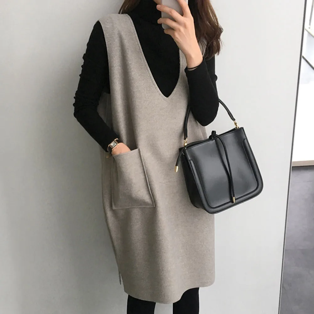 Женское Короткое платье-жилет без рукавов, осенне-зимние свободные повседневные платья в японском стиле с карманами и V-образным вырезом, модные простые женские платья