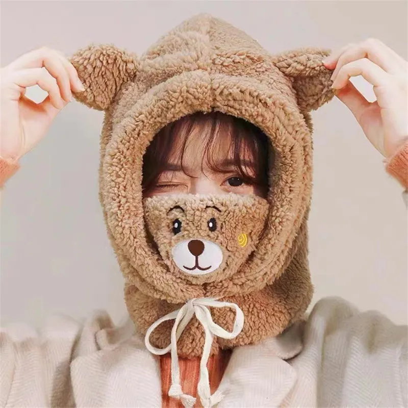 Шапка с мультяшным медведем, женская зимняя шапка, шарф, ветрозащит...