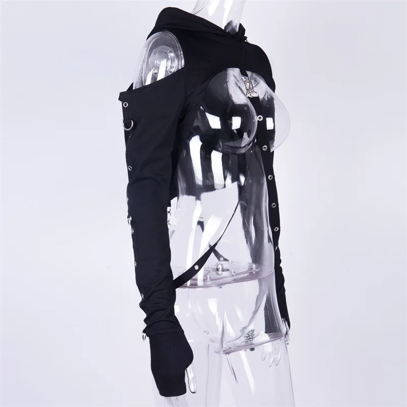 Y2K готические черные толстовки с вырезами, Женский пуловер, свитшоты с декоративными ремешками, уличная одежда, пикантный короткий топ с длинным рукавом