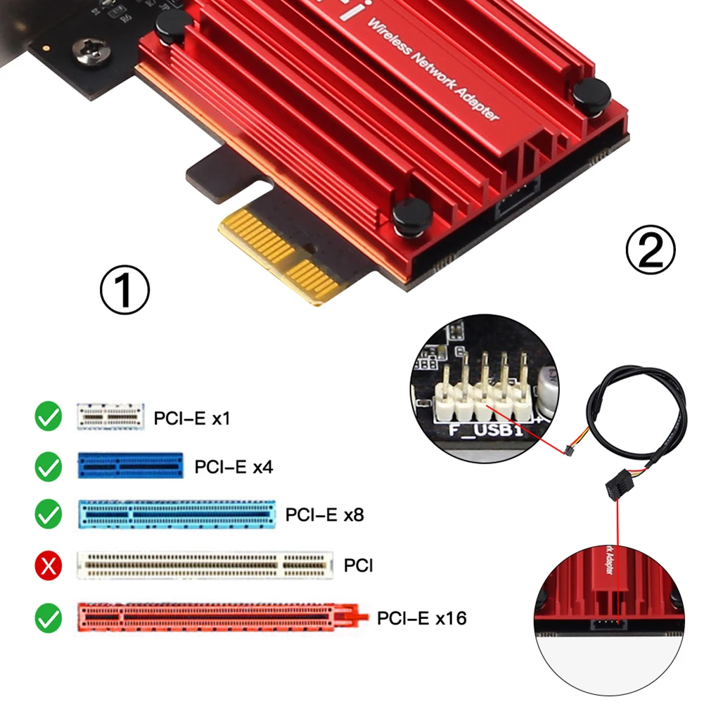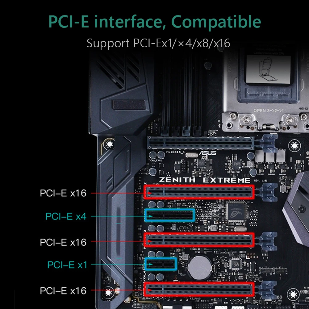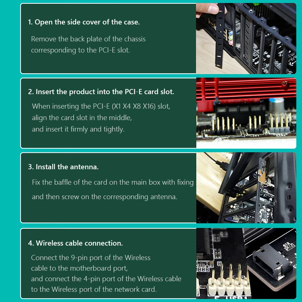 6. Тонкая работа. Антикоррозийный и против деформации перегородки, изготовленные из высокопрочного коррозионно-стойкого металла, против ржавчины и против деформации; PCI-E позолоченный палец, совместимый с интерфейсом PCI-E X4 X8 x16, хорошая проводимость, высокая стойкость к окислению и более стабильная передача данных; Позолоченный интерфейс импеданса, более стабильная передача данных нелегко заменить и потерять раму; Пластина адаптера процесса лазерной резки, этот продукт принимает процесс лазерной резки, и четыре стороны плоские и гладкие; Bluetooth-совместимый/WiFi двойной светильник-индикатор. Когда Bluetooth совместим и WiFi подключен, вы можете ясно видеть, что индикатор включен