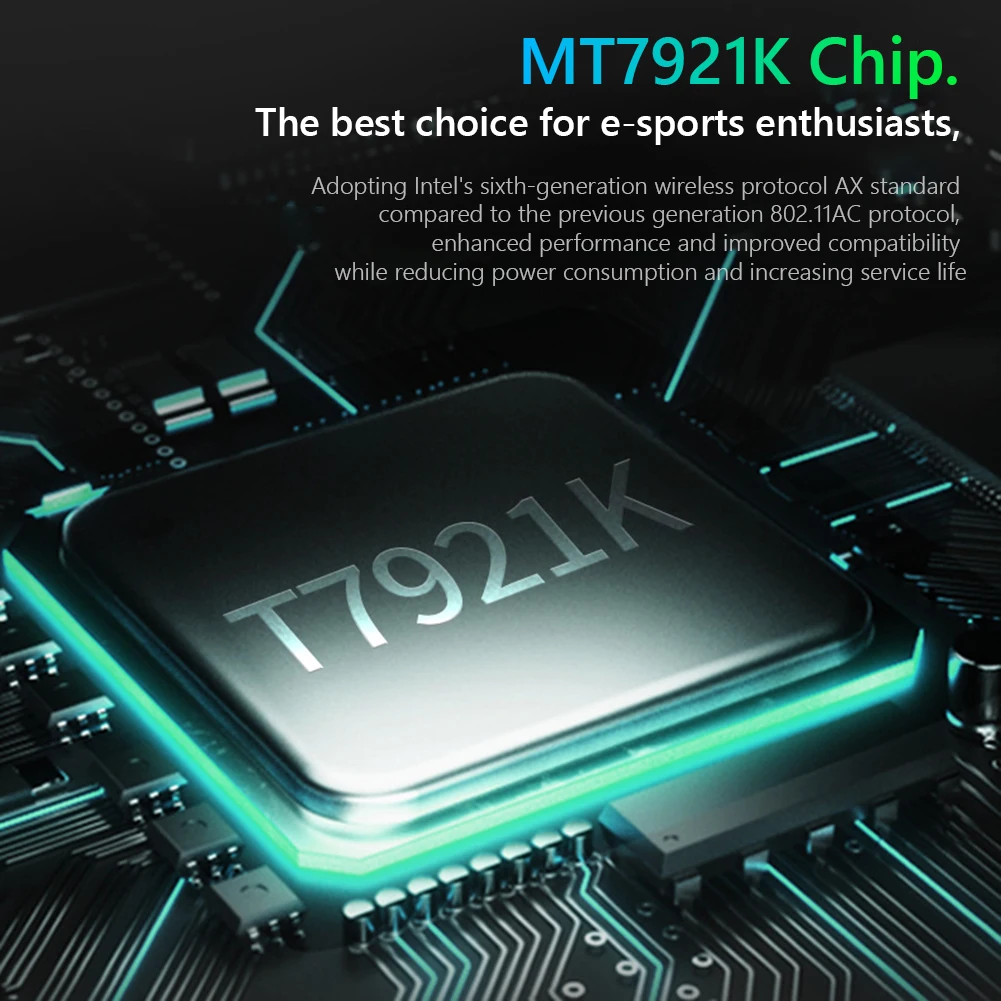 1. Чип MT7921K. Выбор силы энтузиастов электронных видов спорта используется для стандарта Intel sixth generation wireless protocol AX. По сравнению с протоколом 802.11AC предыдущего поколения, он повышает производительность, улучшает совместимость, снижает энергопотребление и улучшает срок службы