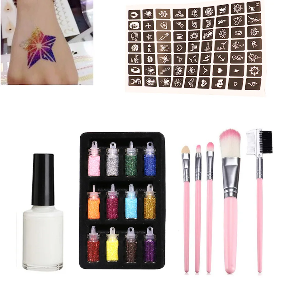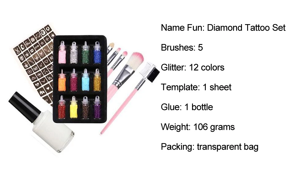 Натуральные Ингредиенты: без химических веществ-без ppd-без аммиака. Перед использованием проведите тест на кожу.Наслаждайтесь волшебной красотой боди-артаЕсли вы хотите создать потрясающее боди-арт для свадьбы или вечерние или просто потренироваться и улучшить свои художественные навыки, этот замечательный набор боди-арт-прекрасный способ раскрыть свое творчество!Богатые аксессуары:Посылка включает в себя:Блеск * 12 бутылок (блистерная коробка стеклянная бутылка 12 цветов/коробка)Клей * 1Кисть * 5Пустотелый шаблон татуировки 1 (горячий стиль)Прозрачная сумка: 1Плюс вес упаковки составляет около 124 граммов