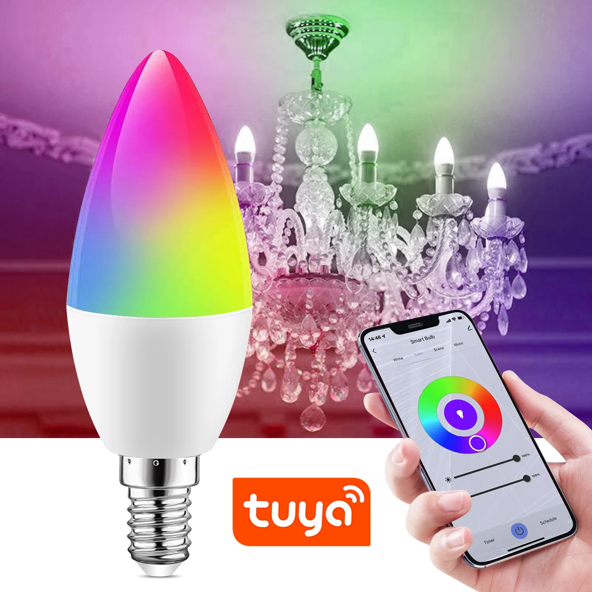 Умная светодиодсветильник лампа Tuya с Wi-Fi, приглушаемая LED лампа для умного дома, работает с Alexa Google Home, E14 RGB CW