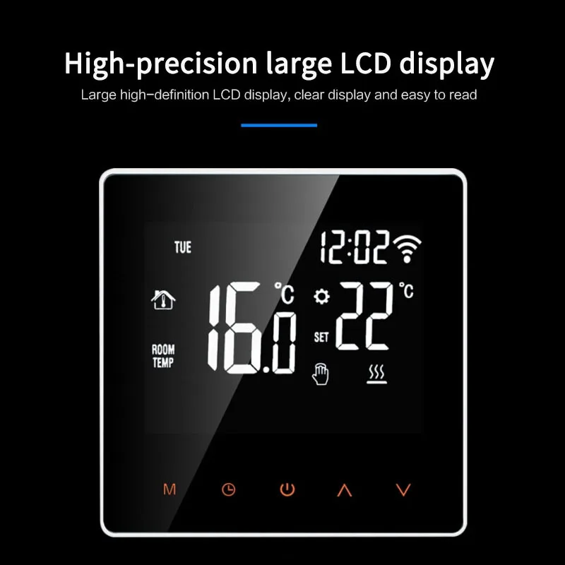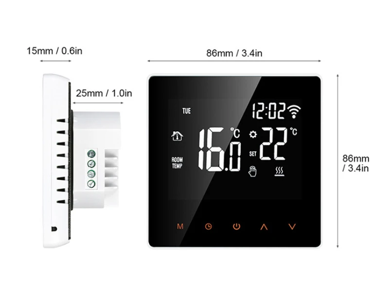 【Голосовое управление 】работа с яндексом Алисой, Amazon Alexa,Google home[Сенсорный ЖК-дисплей] элегантный внешний вид, дизайн с одной стороны, защита от царапин. Большой ЖК-дисплей с сенсорным экраном и задний светильник, легко читать.【APP control】умный термостат, который может управляться вашим телефоном, прежде чем вы вернетесь домой. (Приложение: Tuya)【Руководство/автоматический режим 】свободно выбирать ручной режим или автоматический режим для различных целей.【Точная температура 】 внутренний Датчик пола, восприятие температуры окружающей среды и температуры пола. Автоматическое получение температуры, точность 1 °C.【Weekly programmable】термостат поддерживает различные настройки температуры соответственно с 6 режимами времени ежедневно.【Функция памяти 】не нужно беспокоиться о сбое питания, памяти данных, когда питание выключено.【Блокировка клавиатуры для детей предназначена для предотвращения ошибок в работе детей.【Application】подходит для электрического отопления/водного газового котла/водного отопления. Идеально подходит для дома, офиса, торгового центра, отеля и т. д.СпецификацияТип: Wi-Fi умный термостатМатериал: невоспламеняющийся ПоликарбонатНапряжение: 110-230 В переменного тока, 50/60 ГцМаксимальная нагрузка тока: 16A/3A/3AТочность температуры: 1 ℃Настройка Температуры: 5-95 ℃Ключ: сенсорный ключТовар Размеры: 86*86*40 мм/3,4*3,4 * 1.6inТеплое напоминаниеИз-за термостата со стеклянной зеркальной панелью цвет может меняться в разной среде. Когда вы устанавливаете на стену и включаете питание, он изменится на темный черный.
