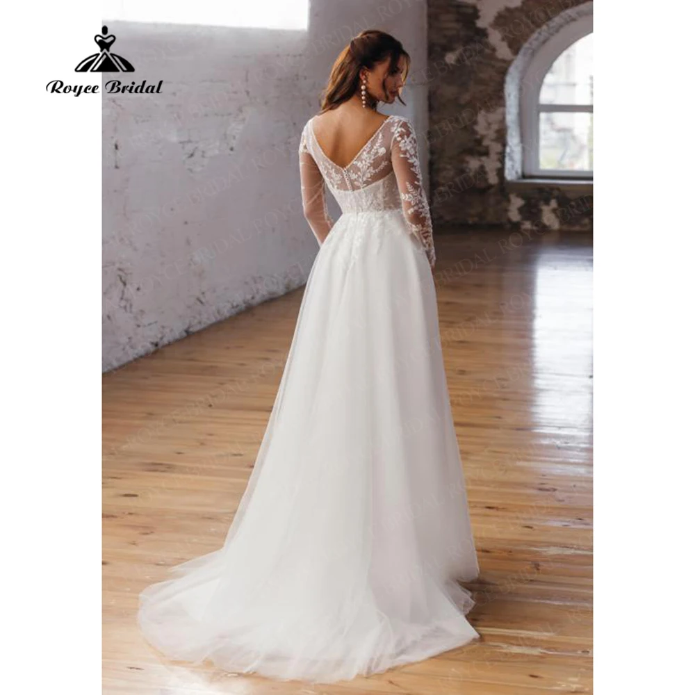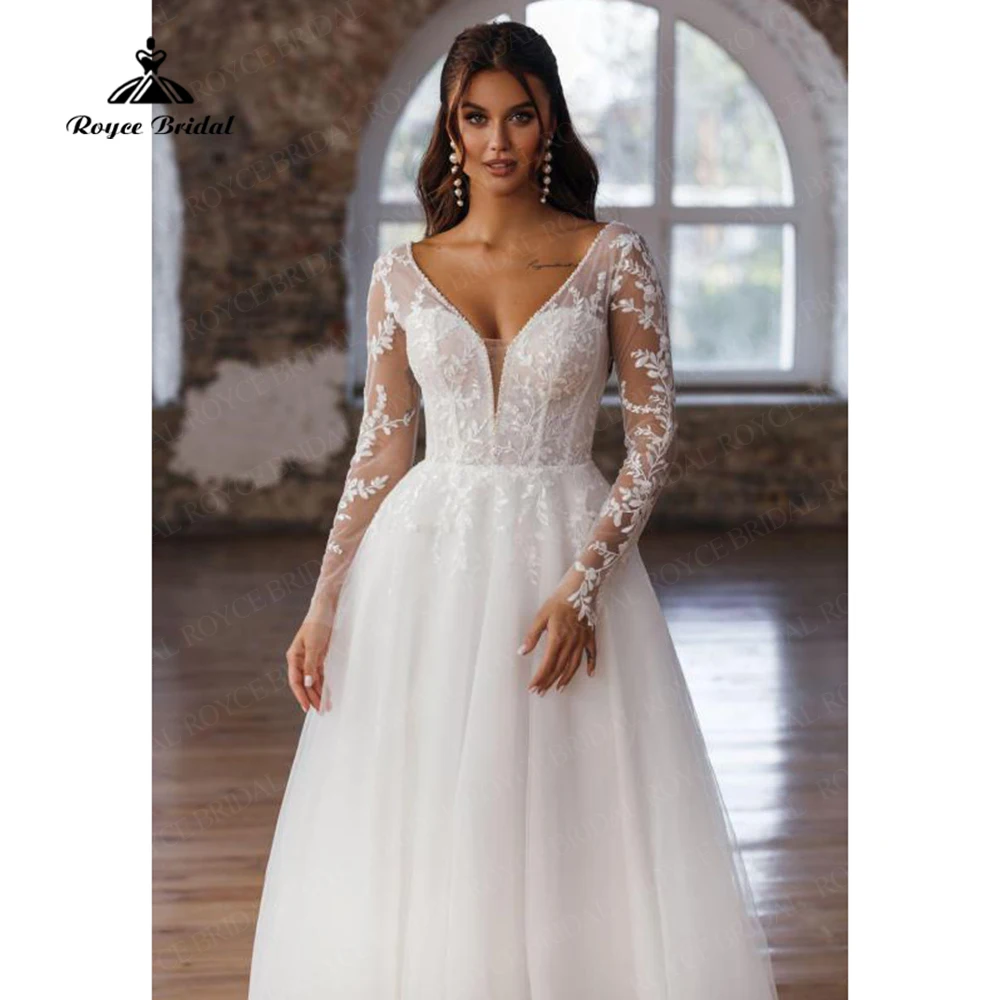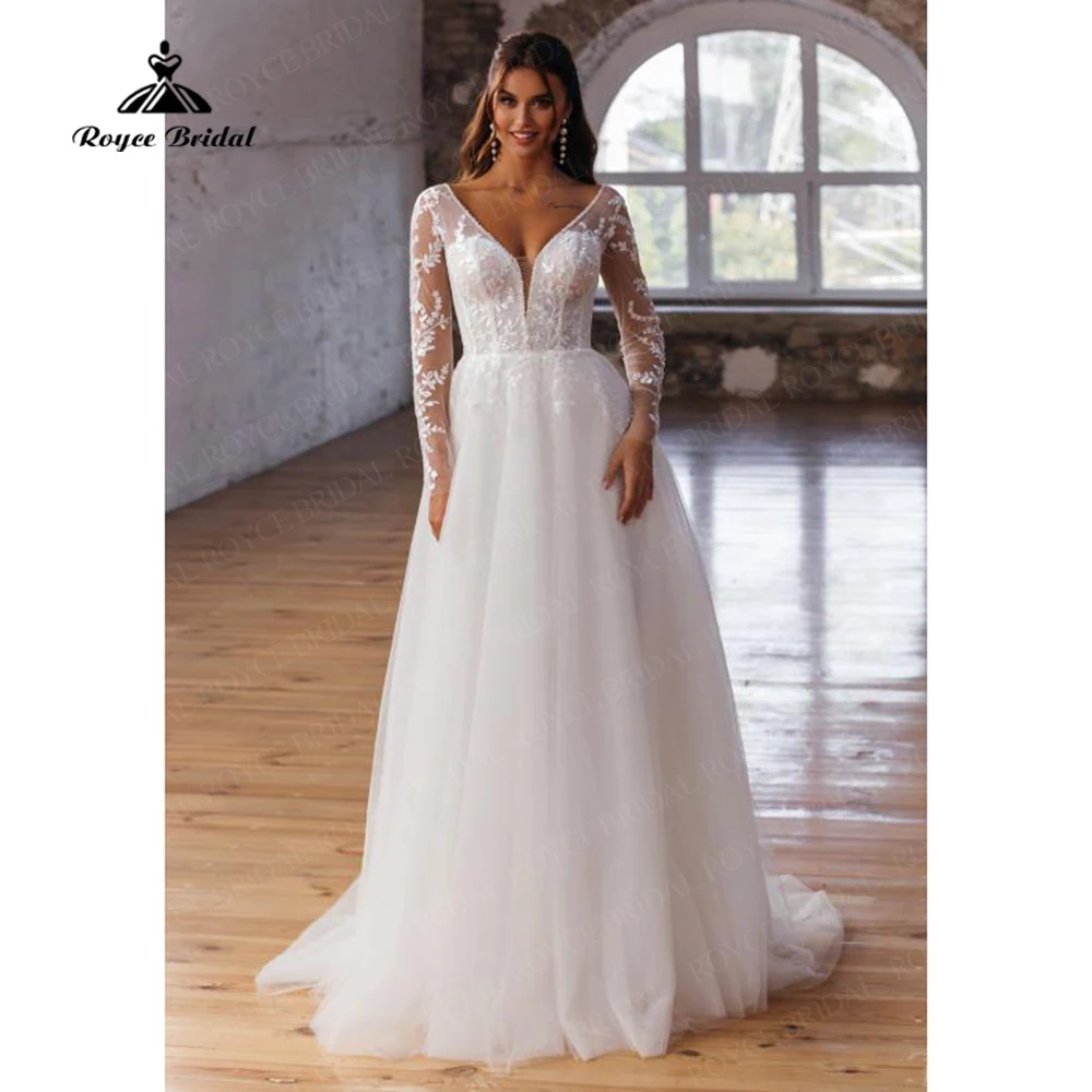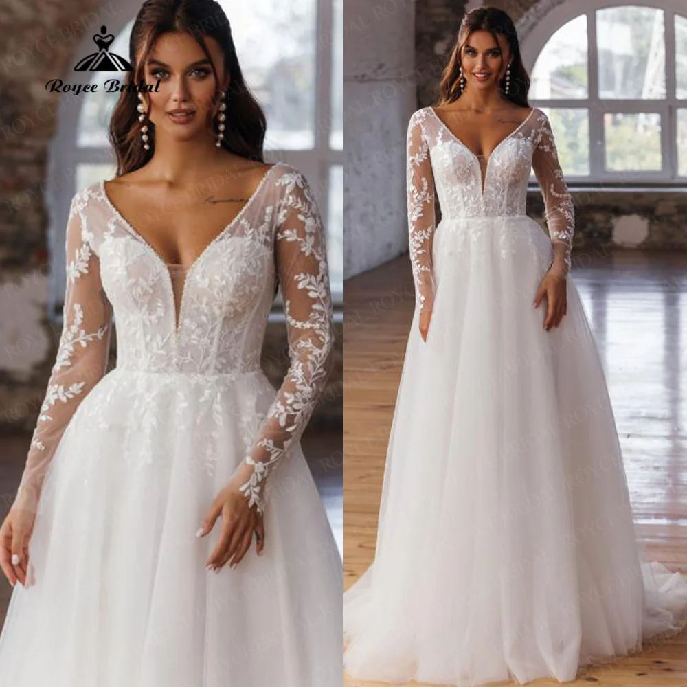 Винтажные кружевные богемные свадебные платья 2022 с V-образным вырезом и длинными рукавами, пляжные свадебные платья, а-силуэт, женское платье с прозрачной спинкой, Новинка