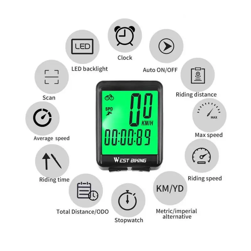 Характеристики: светодиодный подсветка, часы, автоматическое включение/выключение, дальность езды, максимальная скорость, скорость езды, метрические/имперские варианты, секундомер, общее расстояние/ODO, время езды, средняя скорость, сканирование