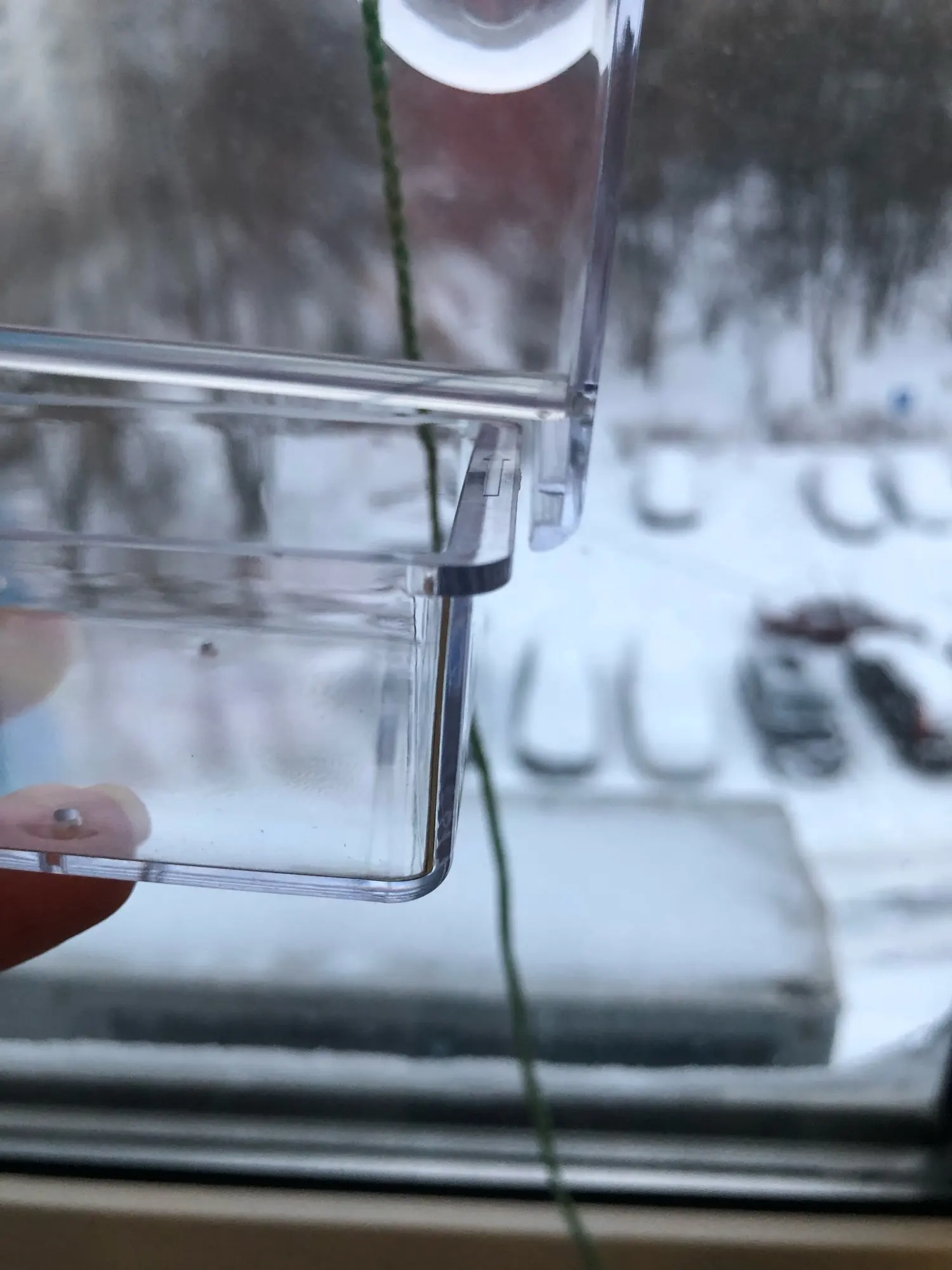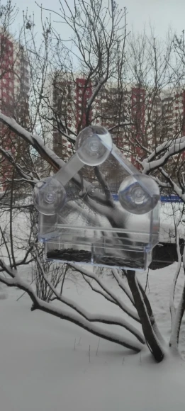 Кормушку пришлось немного допилить, потому что когда вставляешь перекладину-насест, лоток для корма неплотно сидит в пазах, болтается. Подпилила перекладину на концах, чтобы она глубже заходила в отверстия и не так сильно распирала кормушку, а края лотка утолщила скотчем, теперь лоток туго заходит в пазы и крепко держится. Синицы заметили кормушку через 10 дней только, теперь отбоя нет, иногда аж по три штуки садятся)) Присоски и стекло протерла спиртом, держат хорошо, но подстраховалась: ниточкой кормушку привязала к оконной ручке.