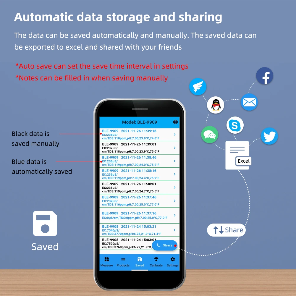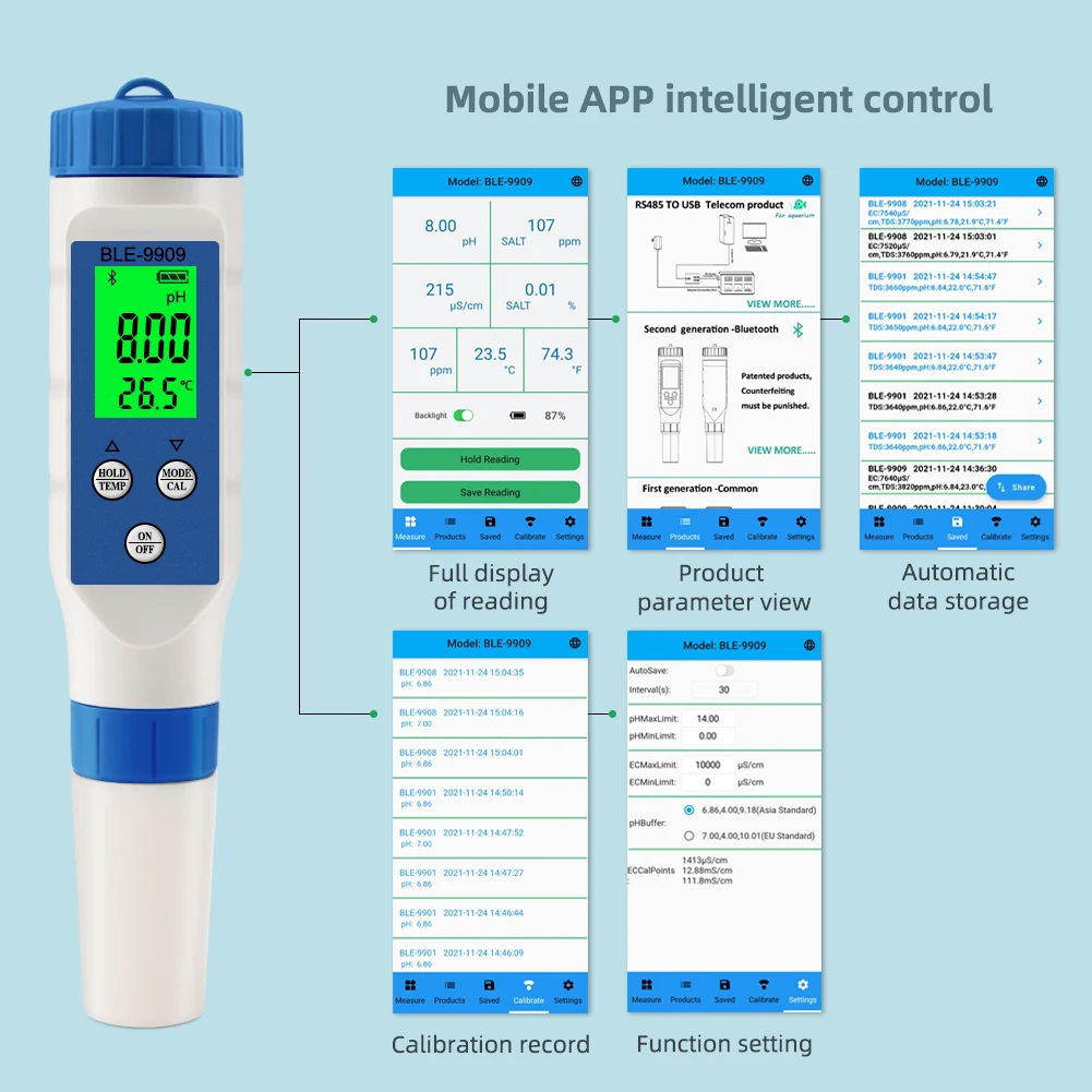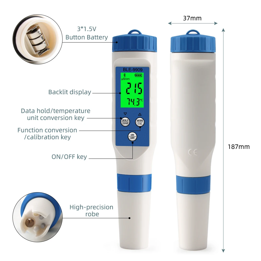 1. Многофункциональный счетчик с Bluetooth: мобильный телефон с интеллектуальным управлением, мобильный телефон с Полноразмерным дисплеем, профессиональное измерение PH/TDS/EC/SALT и темп. Мобильный телефон может управлять подсветкой. Питьевой воды, аквариума, аквариума, бассейна, орошения сельскохозяйственных угодий, лаборатории и т. Д.2. Облачная система управления данными: Точная передача данных Bluetooth в реальном времени, синхронизация времени и записи данных, обмен данными или печать таблицы excel, мобильный телефон может просматривать калибровочную запись.3. Автоматический калибровочный тестер: с высокочувствительным сменным зондом, прост в эксплуатации, автоматически калибруется pH, два набора калибровочных точек являются необязательными4. Многофункциональный измеритель с автоматической температурной компенсацией: температура может повлиять на уровень чтения, цифровой тестер pH имеет еще более лучший диапазон 0,0 °C-60,0 °C (32,0 °F-140,0 °F), автоматическая компенсация температуры может гарантировать, что вы получаете лучшее чтение, так что вы можете проверить с уверенностью в любой среде (4,0 + 6,86 + 9,18/4,0 + 7,00 + 10,00).5. Высокоточный тестер воды: Высокоточный алгоритм чипа и электрода нашего цифрового тестера качества воды обеспечивает точную и быструю реакцию. Сертификация ЕС CE, китайское/английское переключение, ЖК-дисплей с подсветкой, считывание результатов измерений в любое время. Один ключ для блокировки функции чтения, вы можете просматривать данные в любое время. Может быть установлен для автоматического/ручного сохранения данных. Он может обнаруживать изменения данных о воде в течение длительного времени и автоматически устанавливать интервал времени для записи результатов измерений. Вы можете установить максимальное и минимальное значение. Если результат измерения не находится в пределах установленного диапазона, значение будет отображаться красным цветом.BLE-9909 характеристики:1. Модель: BLE-99092. PH: 0,00-14,003. TDS: 0-9999ppm; 10,1-200,0 ppt4.EC: 0-9999 США/см; 10,01-19,99 мс/см; 20,1-400,0 мс/см5. Соль: 0,01-25.00%; 0-9999ppm; 10,1-200,0 ppt6. Температура: 0,1-60,0 °C; 32,1-140,0 °F7. Два набора калибровочных точек являются дополнительными: 4,0 + 6,86 + 9,18/4,0 + 7,00 + 10,008. ATC: 0-60,0 °C; 32,0-140,0 °F9. Рабочая среда: 0,1 ℃-80,0 ℃; RH: максимум 90%10. Класс водонепроницаемости: IP6711. Размер: 187 м * 3*37 мм (7,36*1,46*1,46 дюйма)12. Мощность поставляемый режим: 3*1,5 V батарея (не входит в комплект), Предупреждение о низком заряде батареи13. Вес: 95 г14. Упаковочный лист: 1 * BLE-9909 Bluetooth PH/TDS/EC/соленость/температура воды