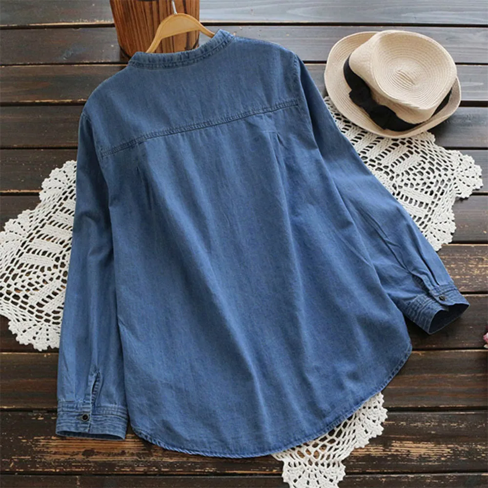 Женские повседневные джинсовые рубашки, блузка с асимметричным подолом и длинным рукавом, женские осенние Топы и блузки на пуговицах с карманами, элегантные блузки для женщин