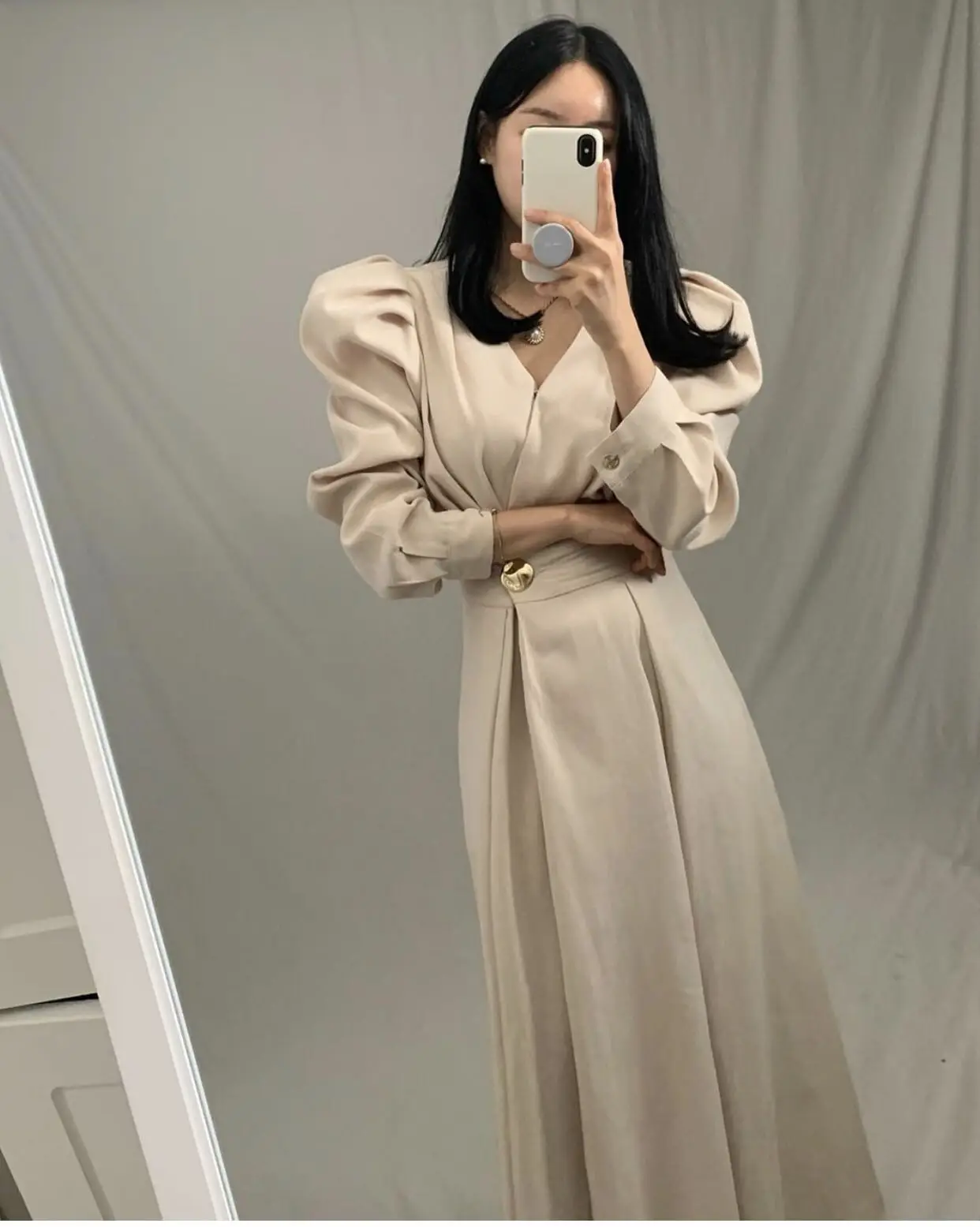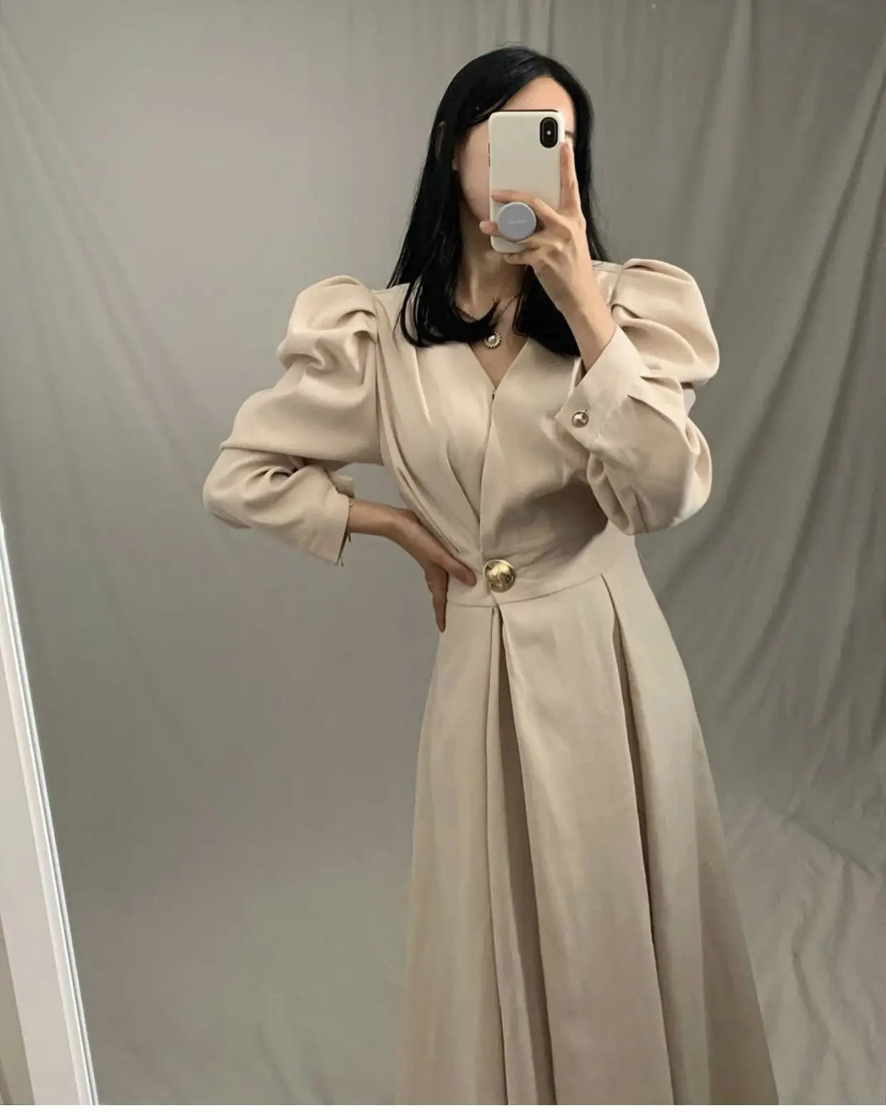 Женское длинное платье цвета хаки, облегающее платье с V-образным вырезом, пышными рукавами и золотыми пуговицами, женская элегантная одежда с высокой талией, весна 2022