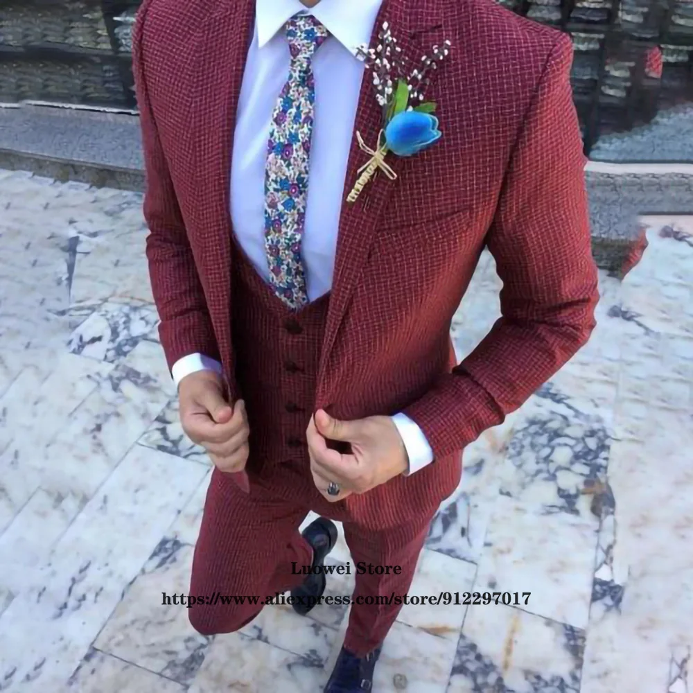 Мужской твидовый костюм для жениха, Красный Клетчатый свадебный смокинг для выпускного, комплект из трех предметов, пиджак, жилет и брюки, официальный деловой костюм для зимы