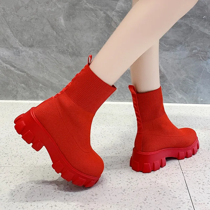 Женские вязаные Ботинки Челси на толстой подошве, красного цвета