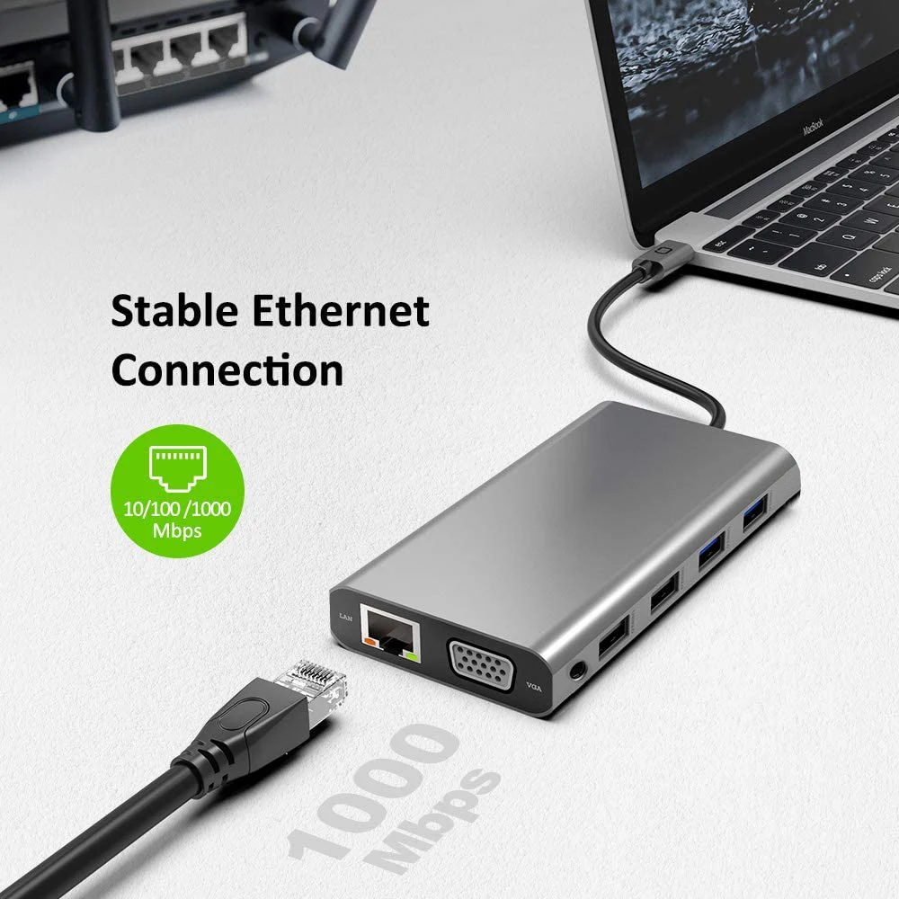 【 12 в 1 док-станция USB-C 】 док-станция для ноутбука прекрасно сочетает функцию usb-c концентратора и док-станции. По сравнению с тяжелой док-станцией и другими концентраторами USB C, это док-станция с тройным монитором, легкий, портативный, мощный с несколькими портами. Встроенные передовые чипы с низким энергопотреблением, более быстрым рассеиванием тепла и более высокой эффективностью передачи данных уточняйте новую концепцию док-станции USB C.