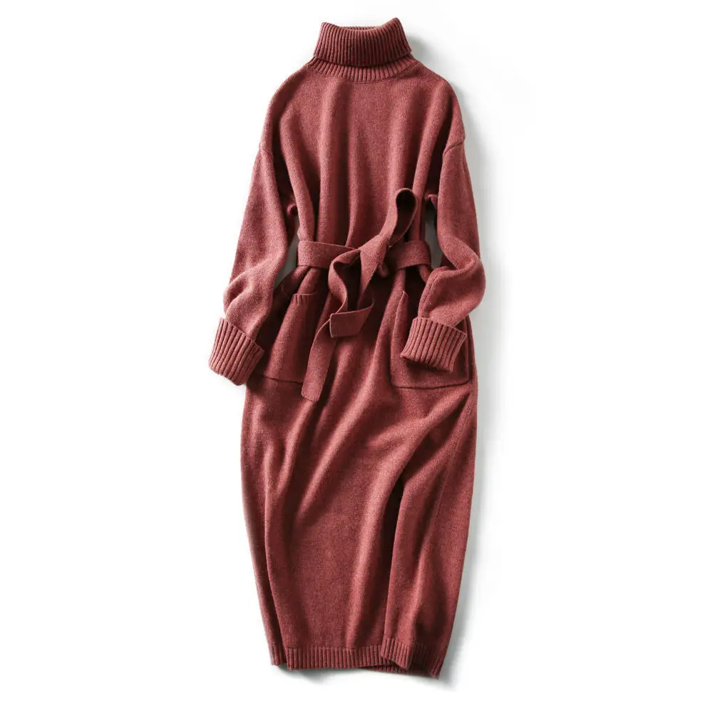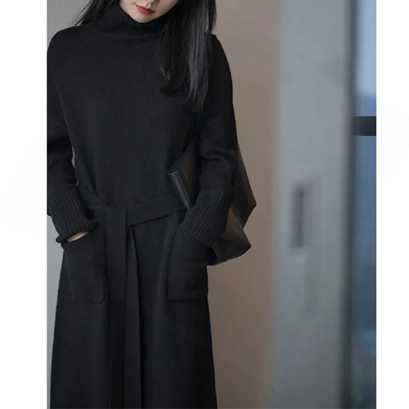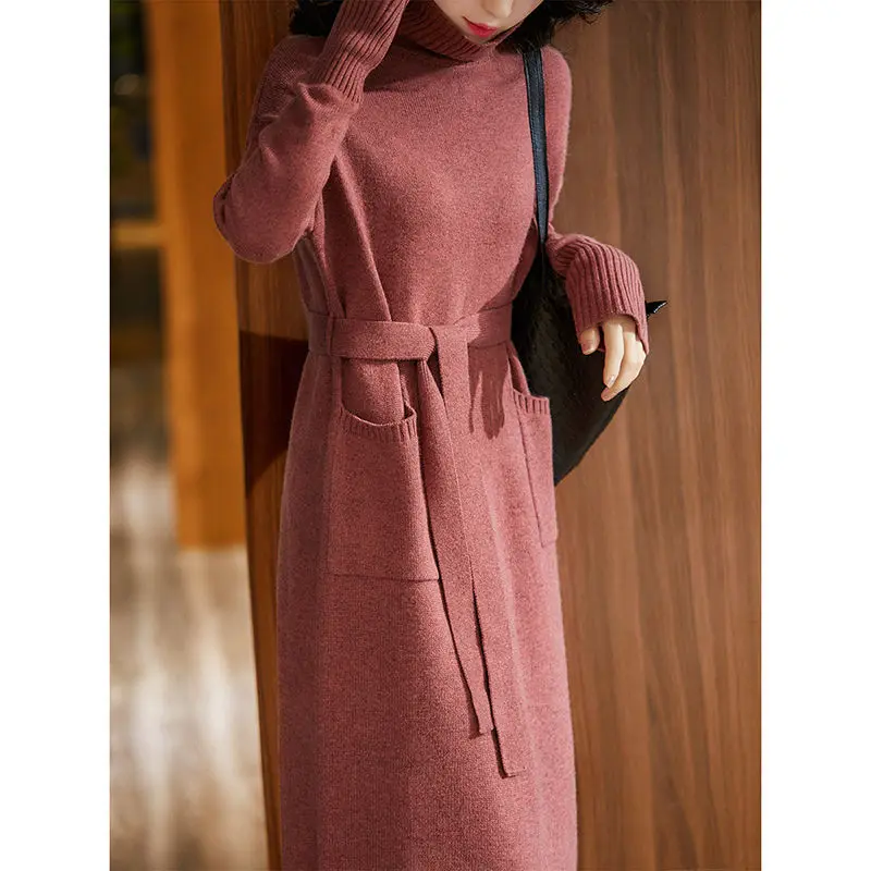 Зимняя вязаная женская одежда, однотонное элегантное платье-свитер для интеллектуальной леди нового года, модное трикотажное платье с поясом и высоким воротником