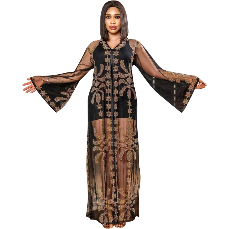 Женский комплект из двух предметов, длинное Сетчатое платье макси с расклешенным рукавом и V-образным вырезом и платье на бретелях, соблазнительное платье-халат с бриллиантами