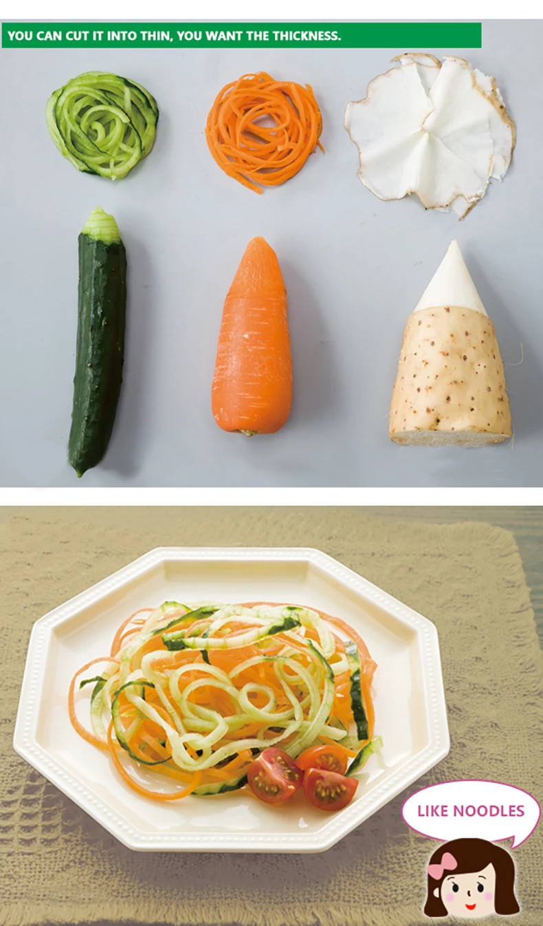 4. Широкий спектр применения: Используйте различные фрукты и овощи, чтобы сделать лапшу и спирали, такие как яблоки, груши, морковь, кабачки, огурцы, тыквы, редис, сладкий картофель, обычный картофель и т. д.