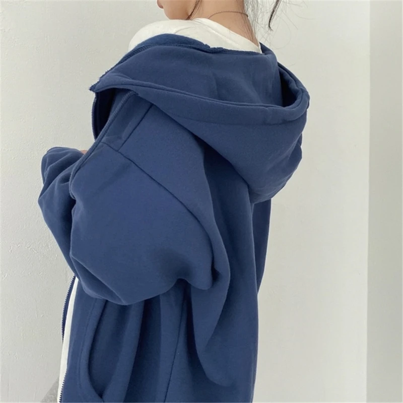 Женские толстовки большого размера на осень и зиму, корейские повседневные однотонные куртки на молнии с длинным рукавом, Свободные флисовые толстовки с капюшоном в стиле Харадзюку