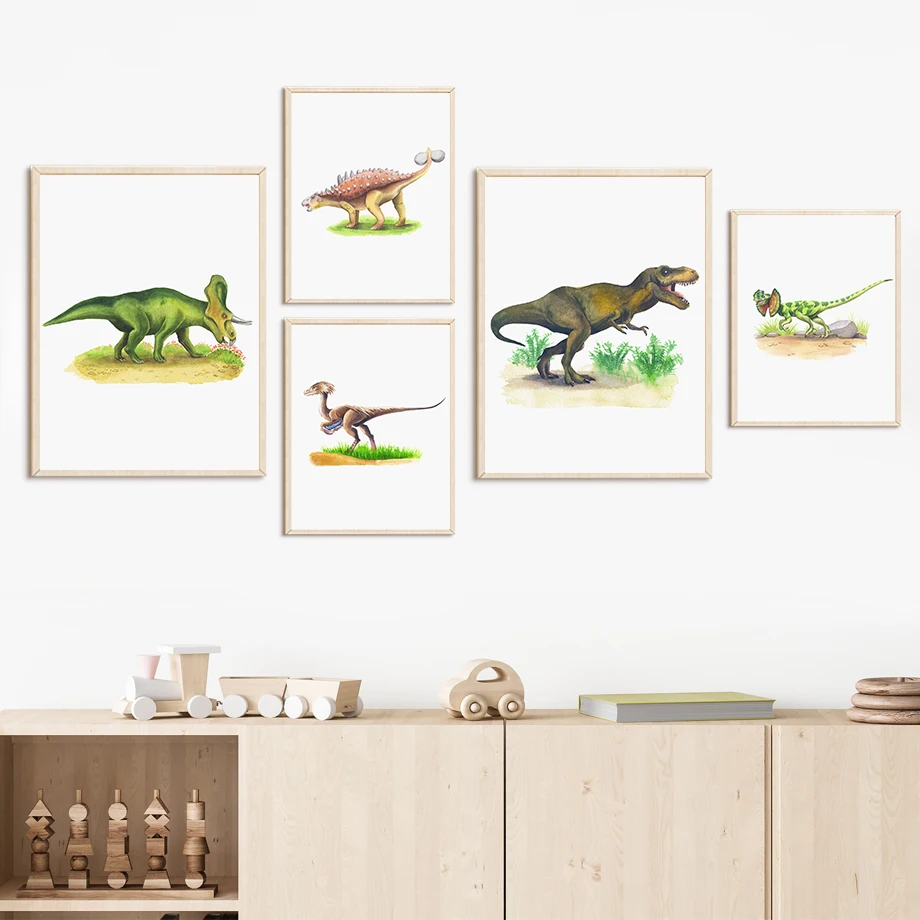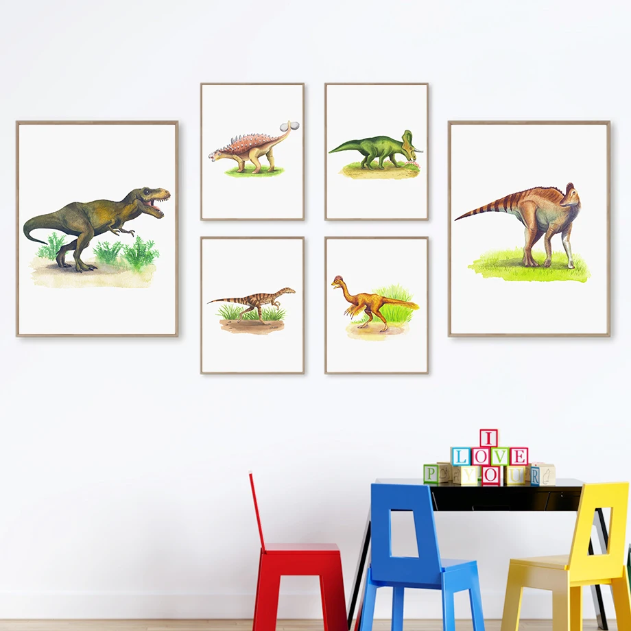 Мультяшные животные, динозавр, трава, детский сад, скандинавские плакаты и принты, настенная живопись на холсте, настенные картины, декор для детской комнаты