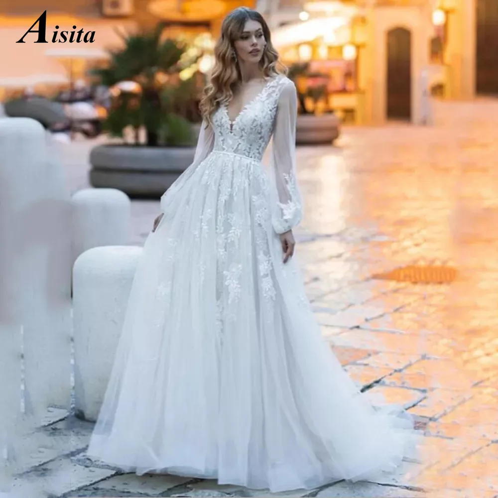 Женское свадебное платье It's yiiya, белое кружевное платье с V-образным вырезом, длинными рукавами-фонариками и открытой спиной на лето