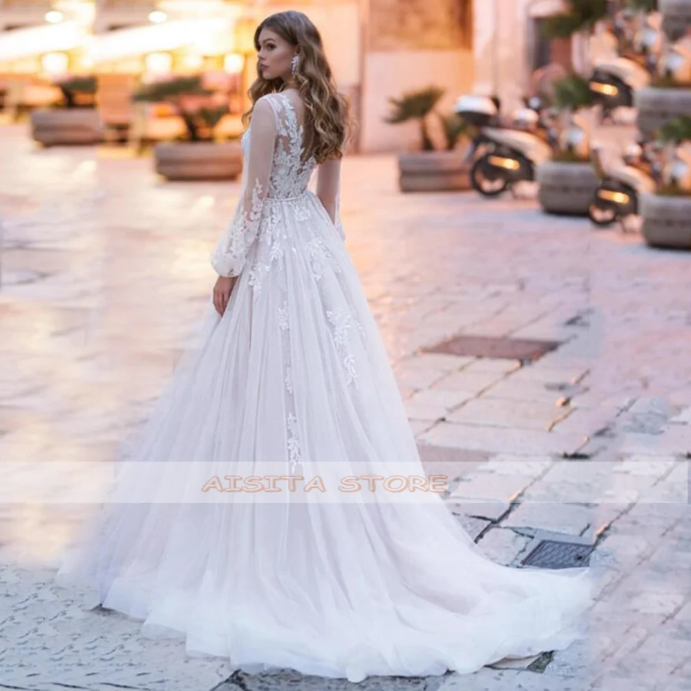 featureswith luxury lace appliques, long lantern sleeve and illusion back