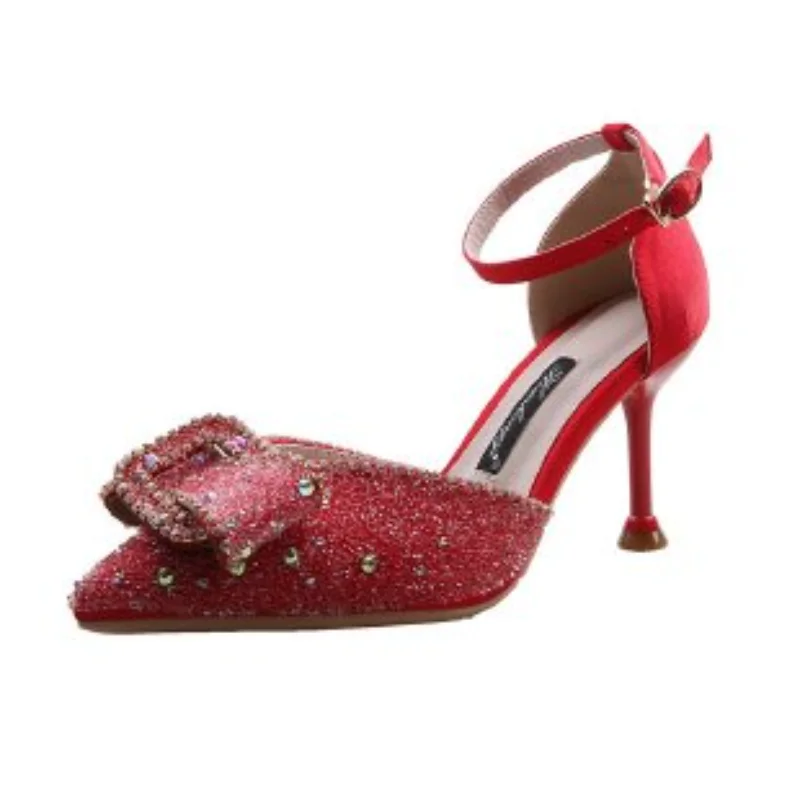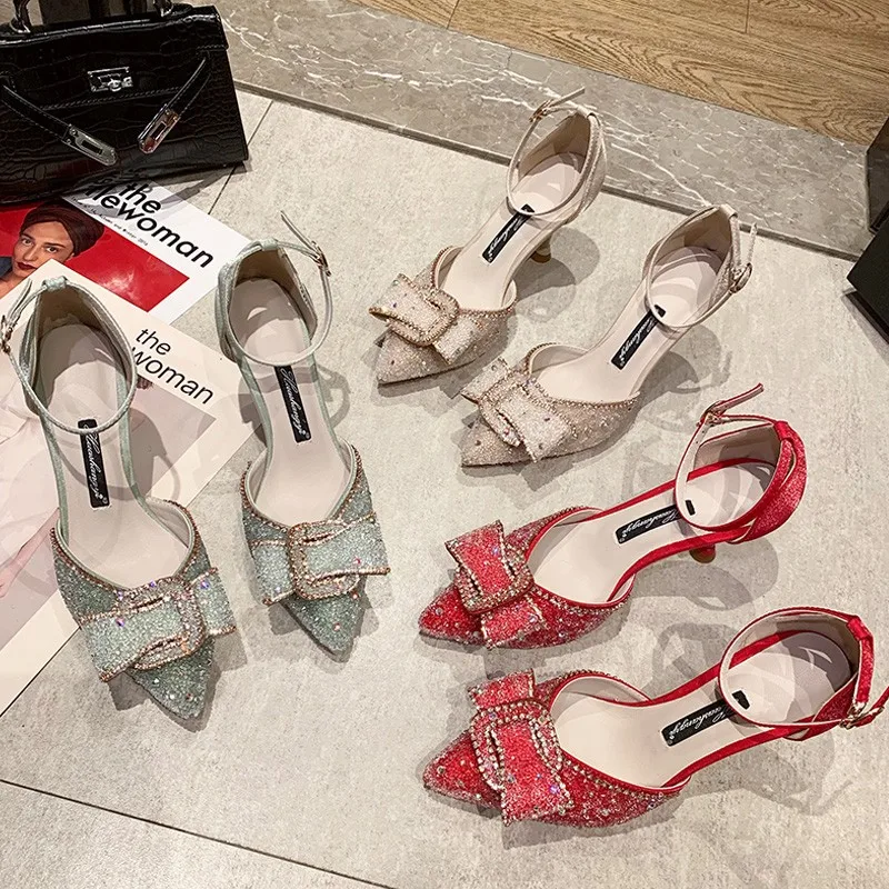 Новинка 2022, модные туфли на тонком каблуке с бантом и ремешком на щиколотке для свадьбы, женские Роскошные вечерние туфли-лодочки стразы, женская обувь с острым носком