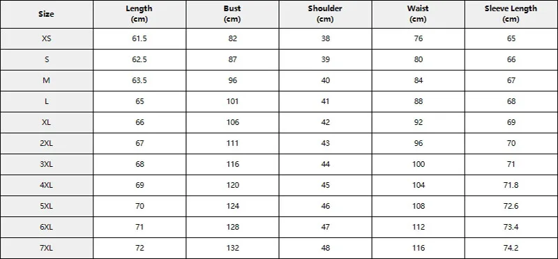SizeXS, S, M, L, XL, XXL, 3XL, 4XL, 5XL, 6XL, 7XL