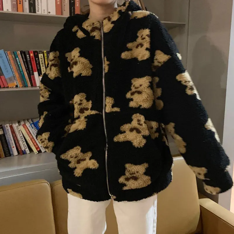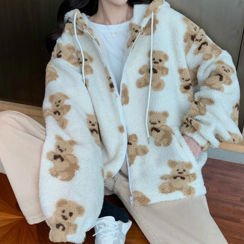 Новинка 2022 года, толстовка с капюшоном и мультяшным медведем из ягненка на молнии, Женское пальто с капюшоном, Повседневная Толстовка большого размера, топы, Женская толстовка, куртка, милое плюшевое пальто