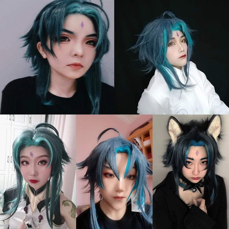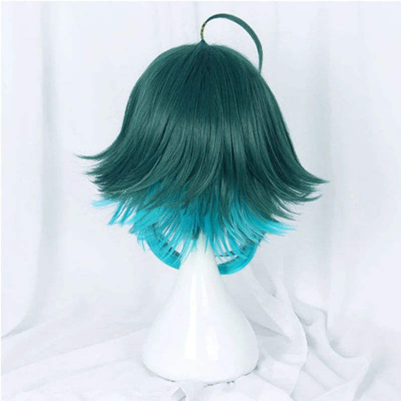 Игра Genshin Impact Xiao косплей парик смешанный темно-зеленый синий короткий высокотемпературный провод волос Хэллоуин ролевые игры парики + парик