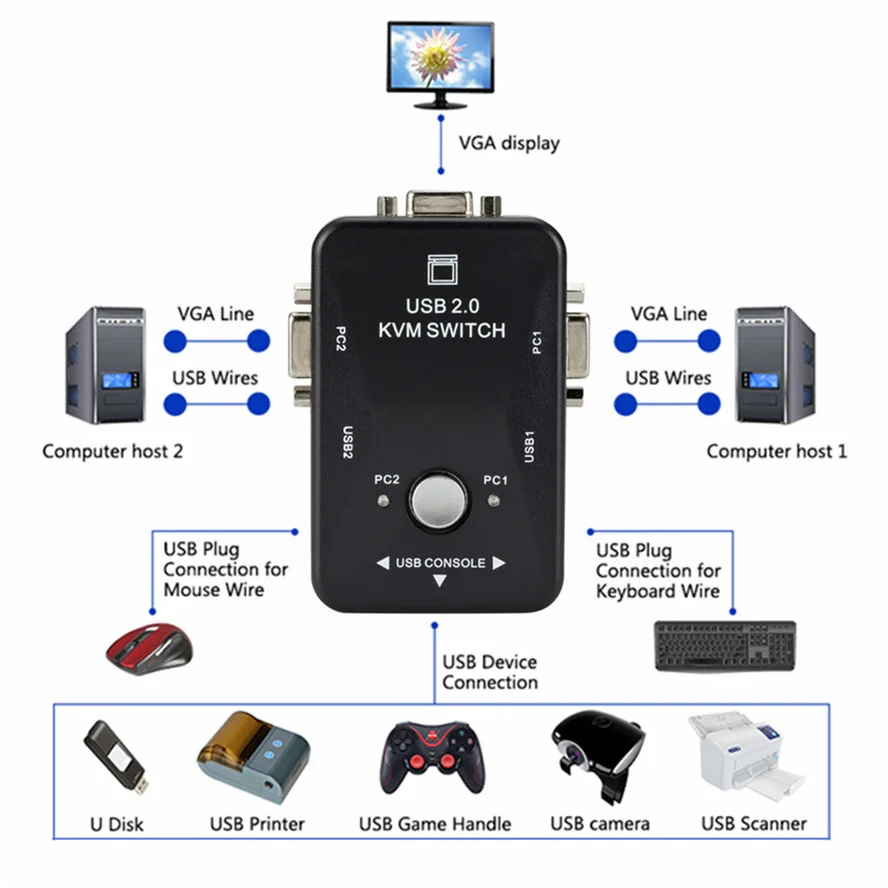 Квм-переключатель USB 2,0, 1920*1440, разветвитель VGA, 2 порта с д...