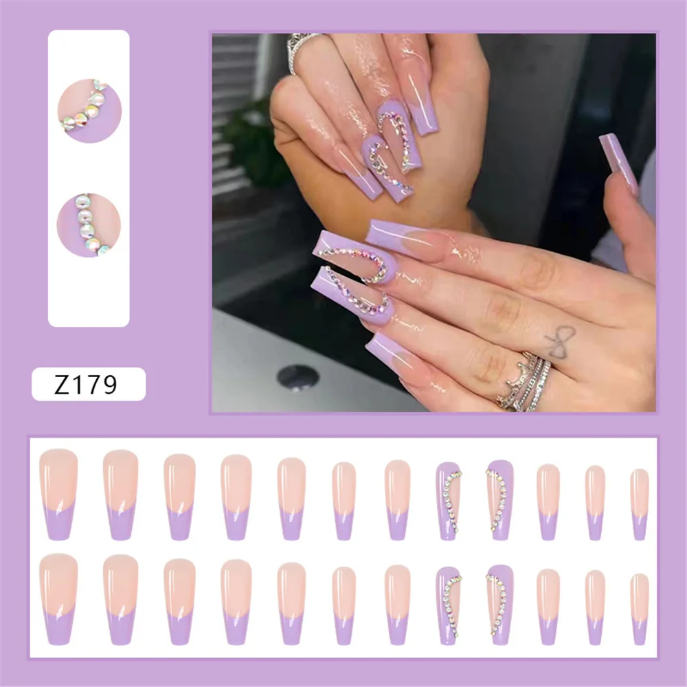 24 шт.кор. пурпурные французские накладные ногти в гробе, маникюрные накладные ногти, накладные ногти в стиле балерины с дизайном Стразы