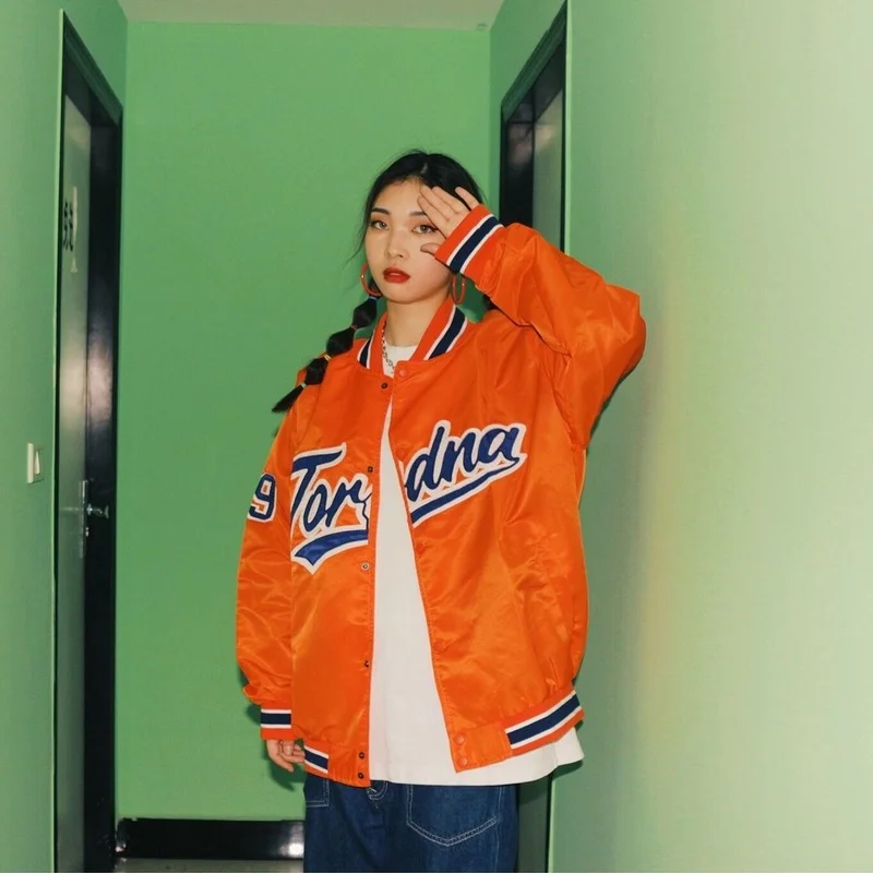 Винтажная Оранжевая Куртка-бомбер с вышивкой, осень 2021, бейсбольн...