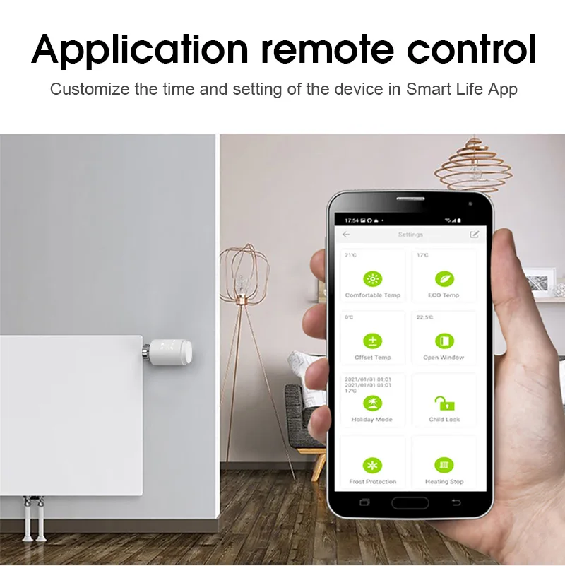 Клапан термостатического радиатора (TRV)-это саморегулирующийся клапан, устанавливаемый на радиатор системы отопления горячей воды, чтобы контролировать температуру комнаты, изменяя поток горячей воды на радиатор. С помощью TRV TV02 вы можете удобно регулировать температуру в помещении от 5 до 30 ℃ и экономить более 15% энергии.