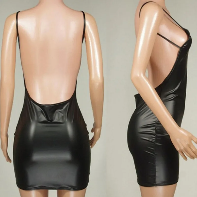 Сексуальное платье с открытой спиной, короткое платье для клувечерние, однотонное черное латексное обтягивающее мини-платье с бюстгальтером пуш-ап