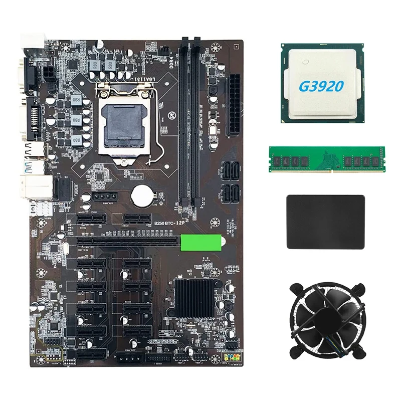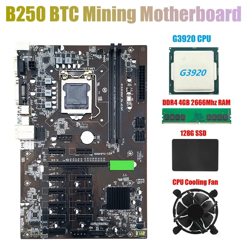 Материнская плата для майнинга B250 BTC с ЦП G3920 или G3930 + вентилятор + DDR4 4 Гб 2666 МГц ОЗУ + 128 Гб SSD 12x слот для графической карты LGA 1151 для BTC
