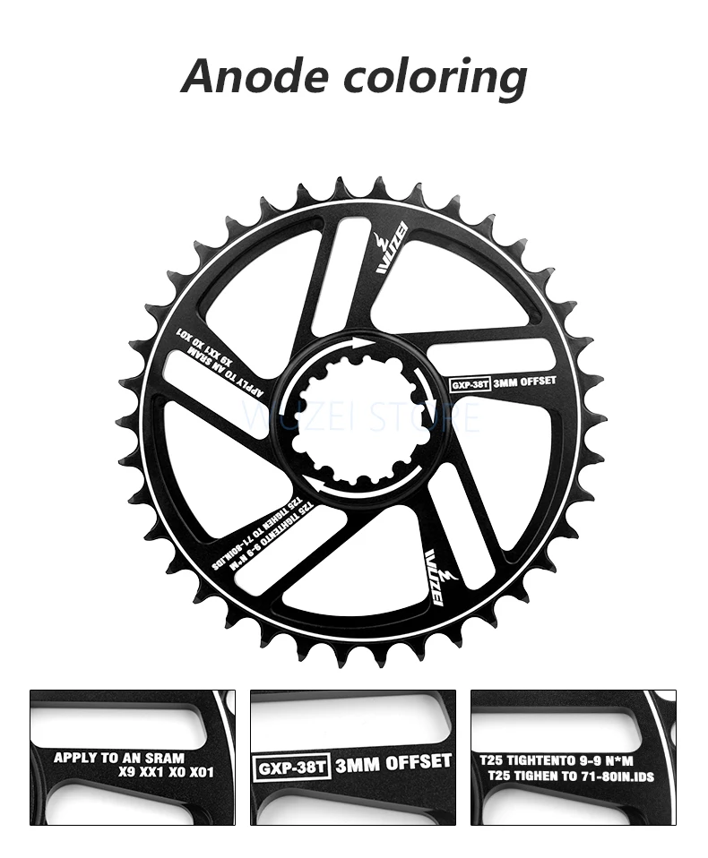 Бренд: WUZEIМатериал: 7075 алюминиевый сплавПроцесс: Повышение твердости T6Смещение центра: 3 и 6 градусовСовместимость со всеми рукоятками в формате SRAM GXP Чередование узких и широких зубов делает цепочку более стабильной и гладкой. Цепь не легко отвалить