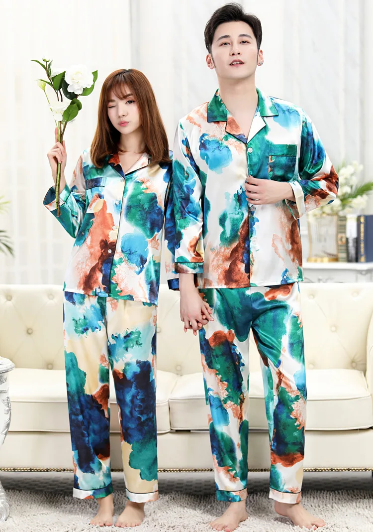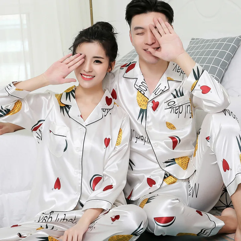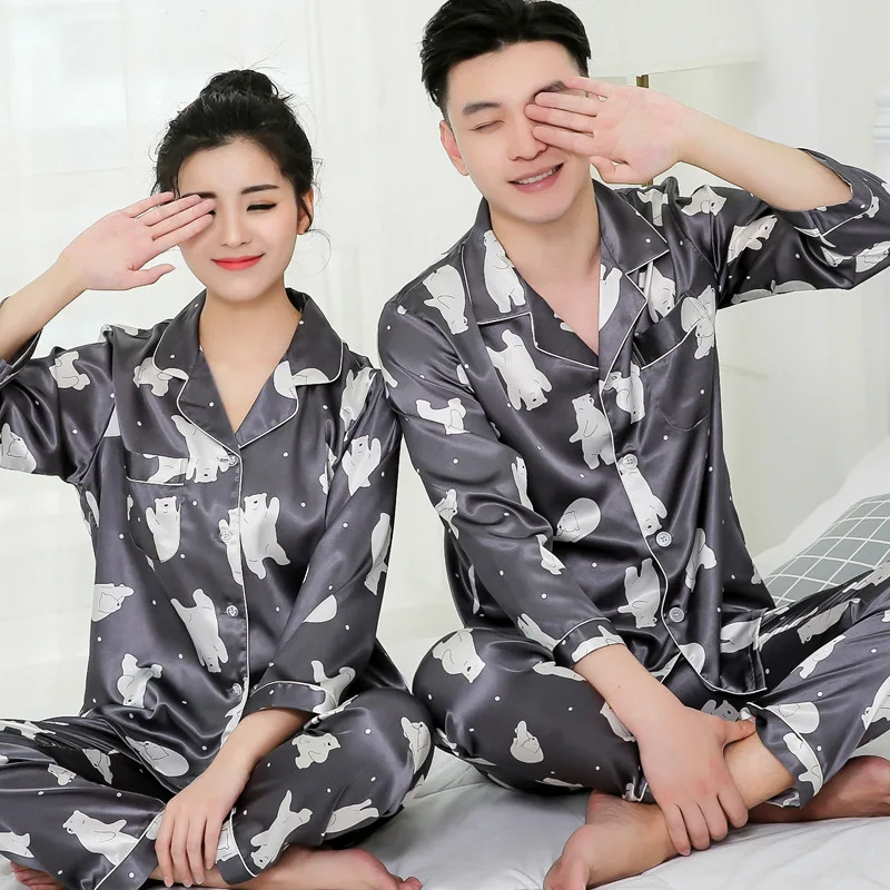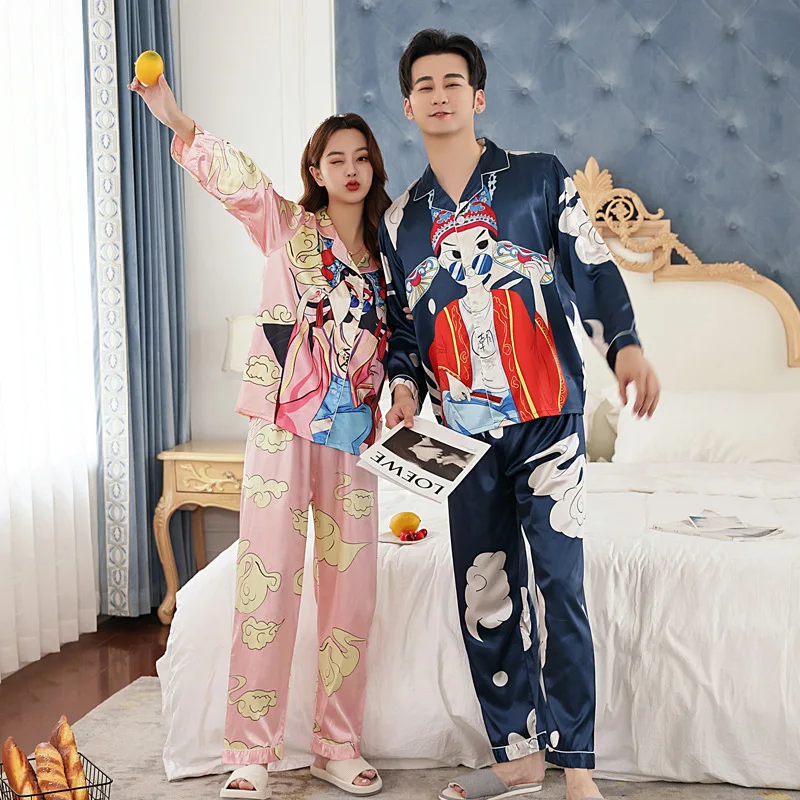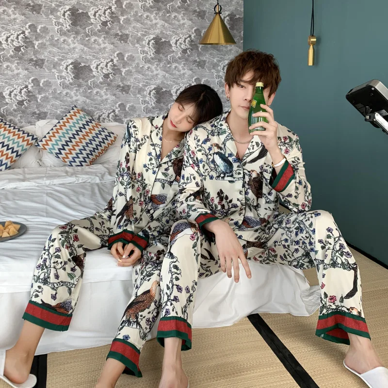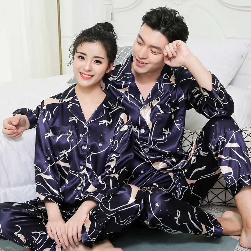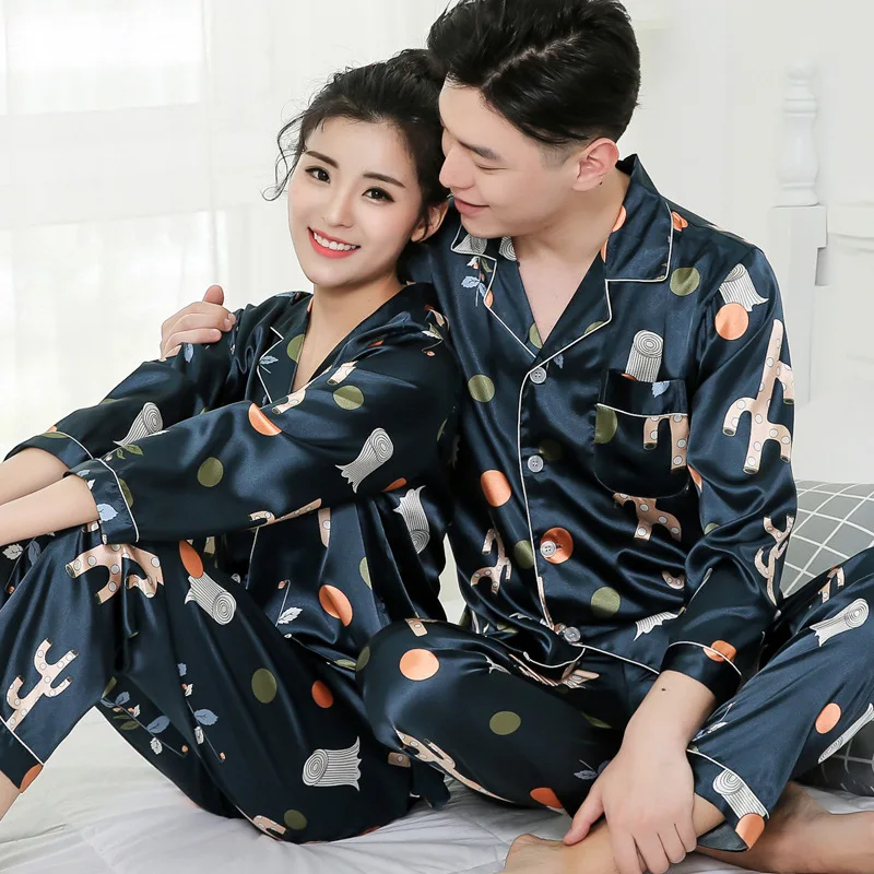 Тонкие пижамы с принтом, одинаковые пижамы с длинным рукавом для пар, шелковые пижамы для женщин, топы для сна, штаны, мужской пижамный комплект, пижамы