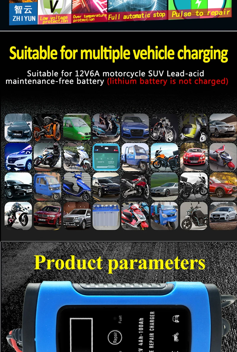 Описание:• Входное напряжение: 100-220 В переменного тока, 50-60 Гц• Номинальная мощность: 12 В постоянного тока, 6 А Макс.• Диапазон батарей: 4Ah-100Ah• Эффективность: приложение. 85%.
