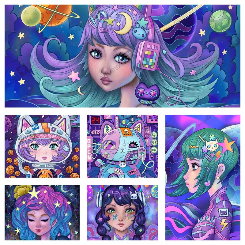 Алмазная 5D картина сделай сам, фиолетовая планета, девочка, Звездный Кот, квадратнаяКруглая Мозаика AB Drill, наборы для вышивки, украшение для дома